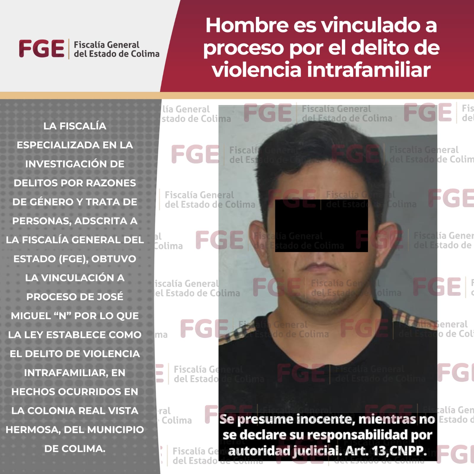 a Fiscalía Especializada en la Investigación de Delitos por Razones de Género y Trata de Personas, adscrita a la Fiscalía General del Estado (FGE), obtuvo la vinculación a proceso de José Miguel “N” por lo que la ley establece como el delito de violencia intrafamiliar, en hechos ocurridos en la colonia Real Vista Hermosa, del municipio de Colima.