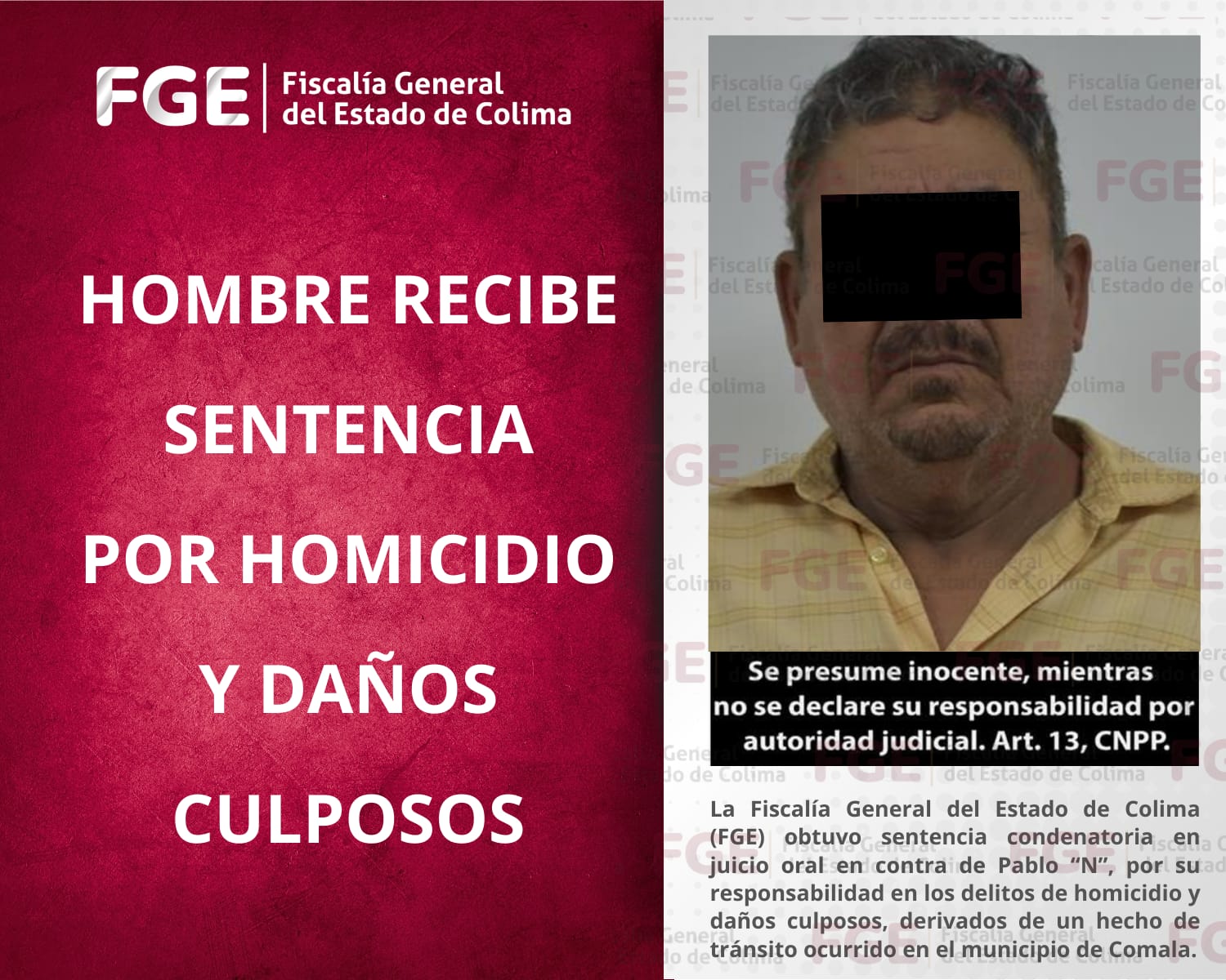 La Fiscalía General del Estado de Colima (FGE) obtuvo sentencia condenatoria en juicio oral en contra de Pablo “N”, por su responsabilidad en los delitos de homicidio y daños culposos, derivados de un hecho de tránsito ocurrido en el municipio de Comala.