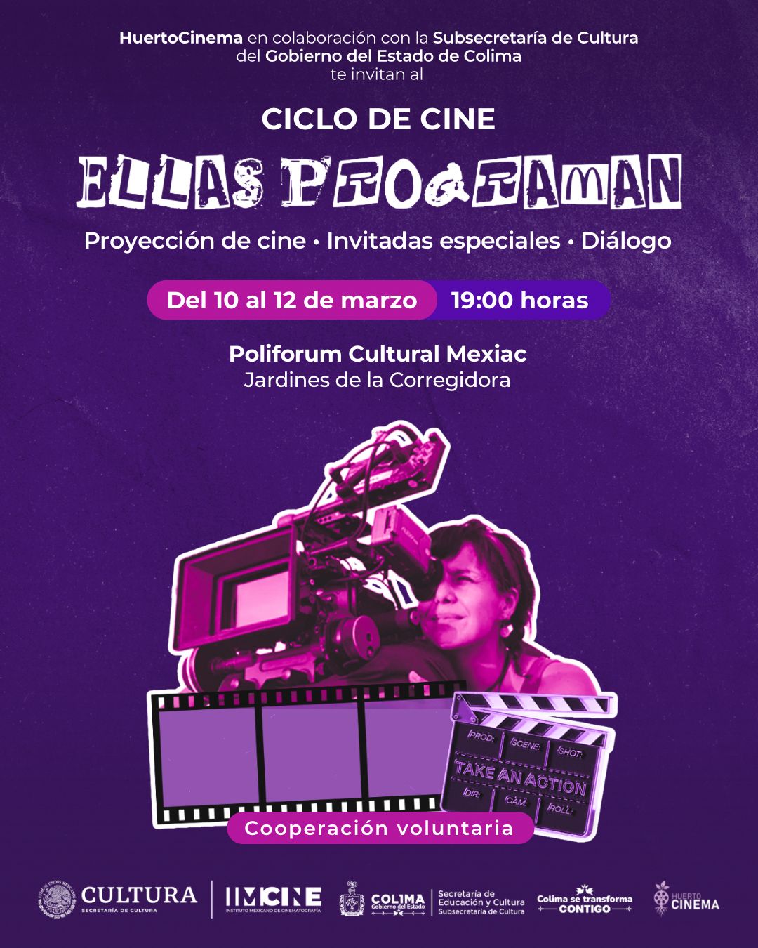 HuertoCinema, colectivo enfocado en la promoción de cine independiente, y la Subsecretaría de Cultura del Gobierno del Estado de Colima, presentaron este lunes la cartelera del ciclo de cine ‘Ellas Programan’, que se realizará en el marco del Día Internacional de las Mujeres, del 10 al 12 de marzo en el Poliforum Cultural Mexiac (en el jardín Corregidora de la capital colimense), ofreciendo funciones gratuitas y conversatorios con promotoras culturales.