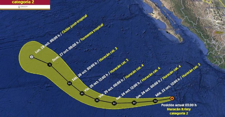 El servicio Meteorológico Nacional (SMN) informó que el huracán Kristy se intensificó a categoría 2 en la escala Saffir-Simpson. Su centro se localiza a 490 kilómetros al sur-suroeste de Isla Socorro, Colima y a 980 kilómetros al sur-suroeste de Cabo San Lucas, Baja California.