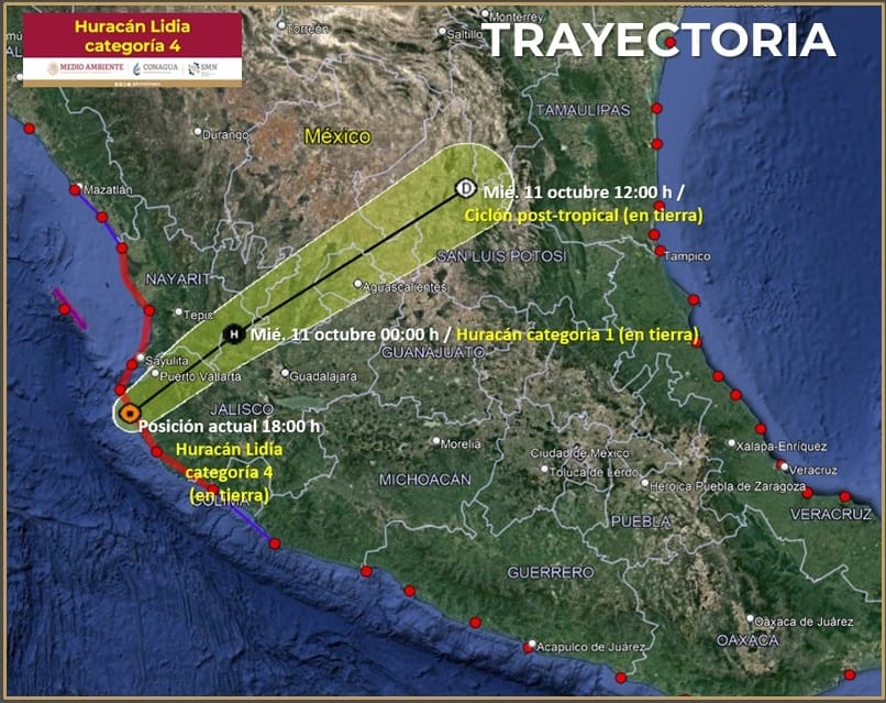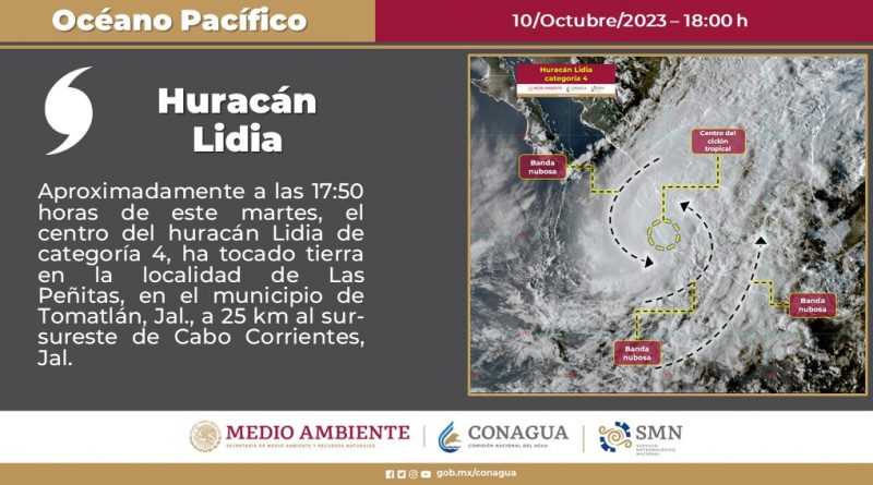 El huracán ‘Lidia’ de categoría 4 en la escala Saffir-Simpson tocó tierra este martes a las 17:50 horas en la localidad de Las Peñitas en el municipio de Tomatlán Jalisco, a 25 kilómetros al sur-sureste de Cabo Corrientes; continuará generando durante esta noche y la madrugada de este miércoles 11 de octubre lluvias puntuales extraordinarias en Colima, Jalisco y Nayarit, informó en su reporte oficial de las 18 horas el Servicio Meteorológico Nacional (SMN).
