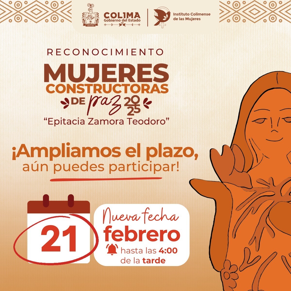 El Instituto Colimense de las Mujeres (ICM) informa la ampliación -hasta el próximo viernes 21 de febrero- del cierre de la convocatoria de ‘Mujeres Constructoras de Paz: Epitacia Zamora Teodoro 2025’, reconocimiento que entrega cada año el Gobierno del Estado de Colima, en el marco del Día Internacional de las Mujeres.