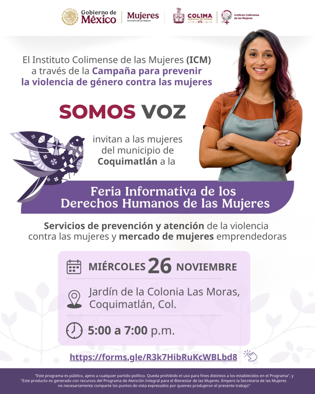 El Gobierno del Estado de Colima, a través del Instituto Colimense de las Mujeres (ICM), invita a la ciudadanía a la Feria Informativa de los Derechos Humanos de las Mujeres, que se realiza este miércoles 26 de noviembre, de 5:00 a 7:00 de la tarde en el jardín principal de la colonia Las Moras, en la cabecera municipal de Coquimatlán.