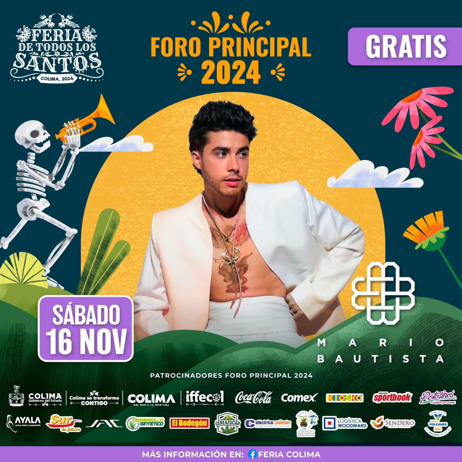 Y para cerrar el sábado, se podrá disfrutar del 5º concierto gratuito en el marco de la Feria de Todos los Santos Colima 2024, a partir de las 8:00 de la noche se presenta Mario Bautista, cantante de género pop, que ha llegado a la cima de las listas más importantes del género, además de ganarse la aceptación del público nacional e internacional.