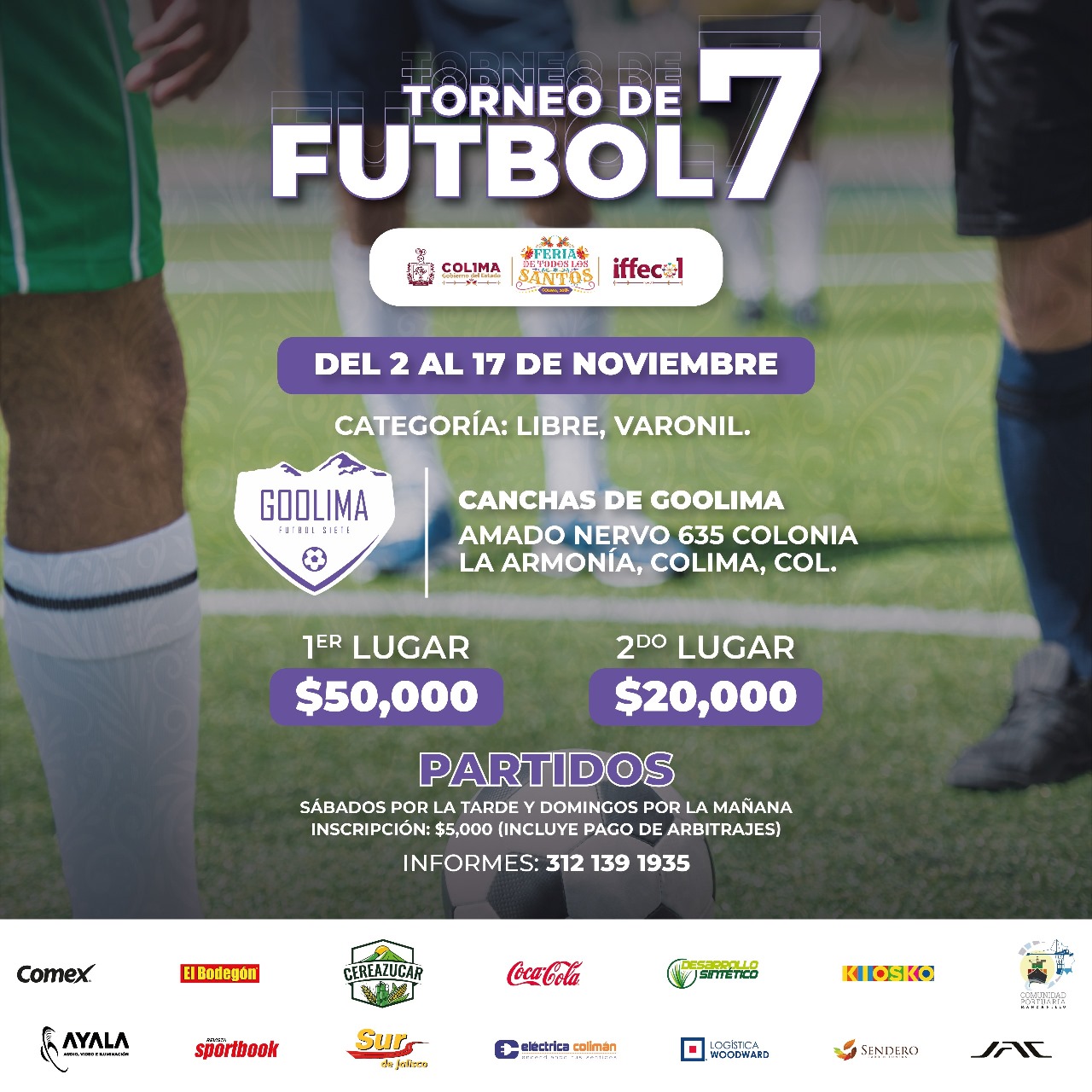 El Instituto de Fomento de Ferias y Exposiciones (Iffecol) del Gobierno del Estado de Colima invita a participar en el primer torneo de Futbol 7, en el marco de la Feria de Todos los Santos Colima 2024, en el que habrá una bolsa de premios en efectivo por 70 mil pesos para los dos equipos finalistas: 50 mil pesos al campeón y 20 mil pesos al subcampeón.
