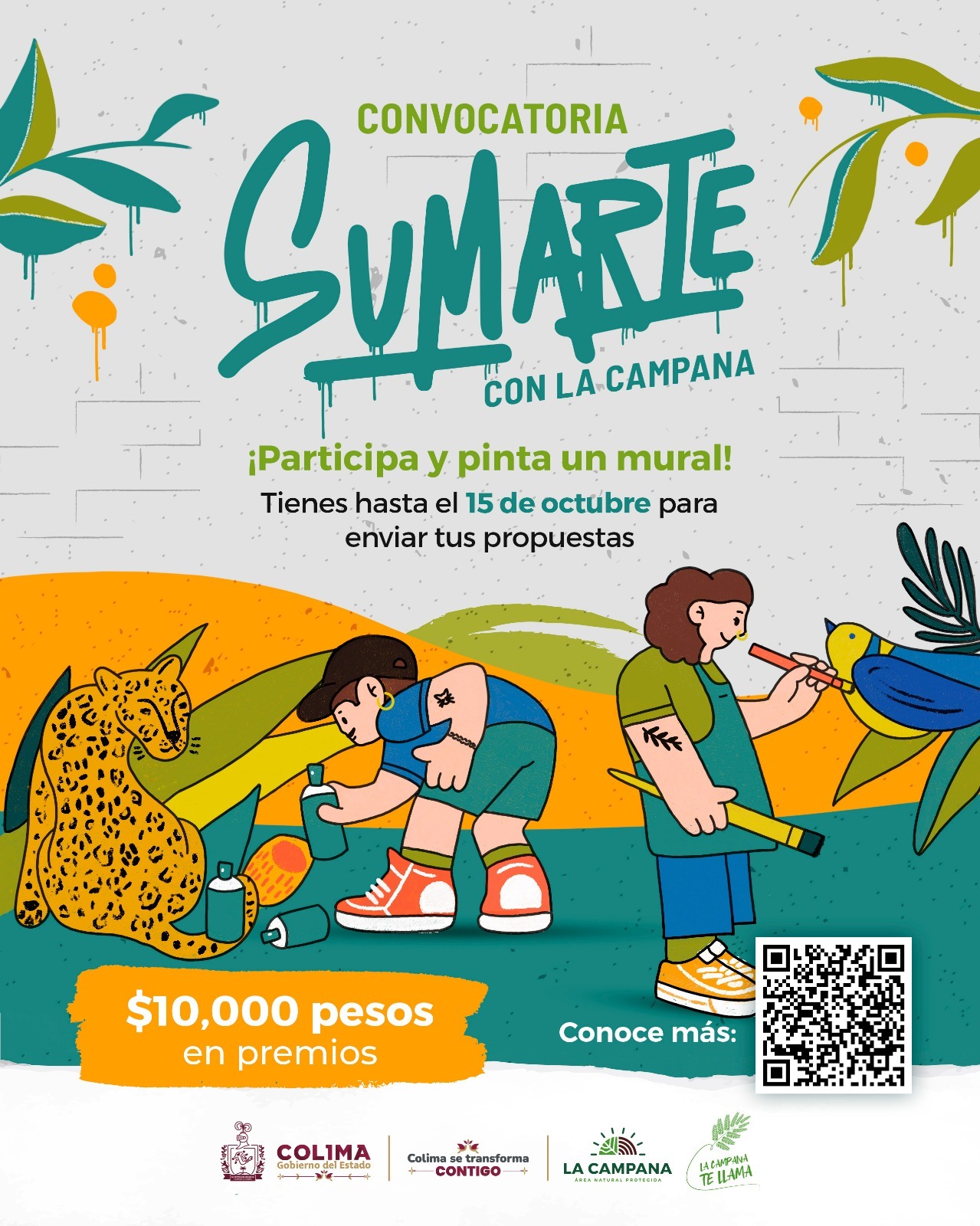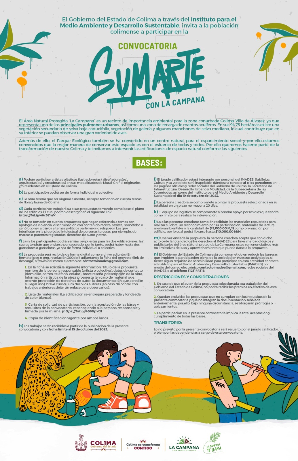 El Gobierno del Estado de Colima, a través del Instituto para el Medio Ambiente y Desarrollo Sustentable (Imades) invita a artistas plásticos ilustradores(as), diseñadoras(es), arquitectas(os) y creadoras(es) a participar en la convocatoria “Sumarte con La Campana”, la cual tiene el objetivo de generar murales en los edificios dentro del área natural protegida.