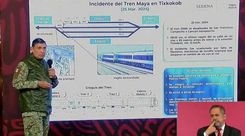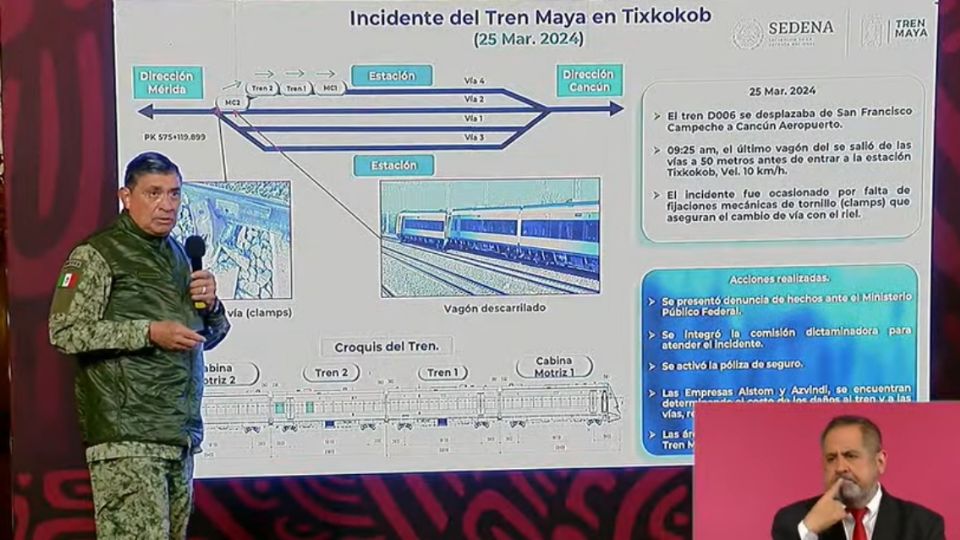 El titular de la Defensa Nacional, Luis Cresencio Sandoval, indicó que a las 9:25 horas, el último vagón del tren que se desplazaba de San Francisco Campeche a Cancún Aeropuerto se salió de las vías a 50 metros antes de entrar a la estación Tixkokob, debido a una falla en las fijaciones mecánicas de un tornillo, conocido como clamp, que asegura el cambio de vía en el riel.
