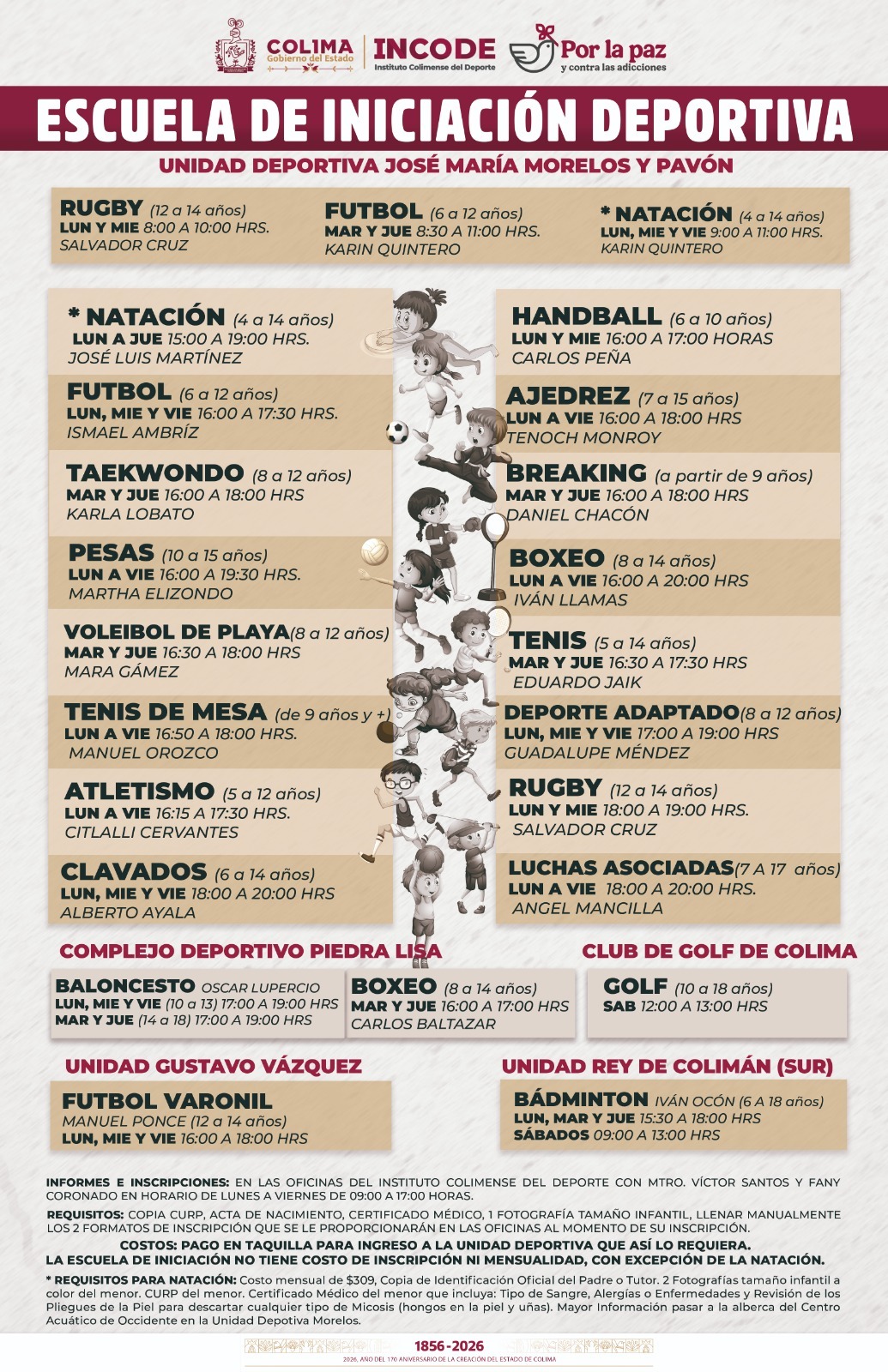 La Escuela de Iniciación Deportiva se ofrece de manera gratuita a la niñez y juventudes, salvo la natación en el Centro Acuático de Occidente; para más información sobre inscripciones y horarios, comunicarse al teléfono 312-395-6127 o acudir a la sede del Incode ubicado en avenida Camino Real No. 402, a un costado de la unidad deportiva ‘Morelos’, de 9:00 de la mañana a 5:00 de la tarde.