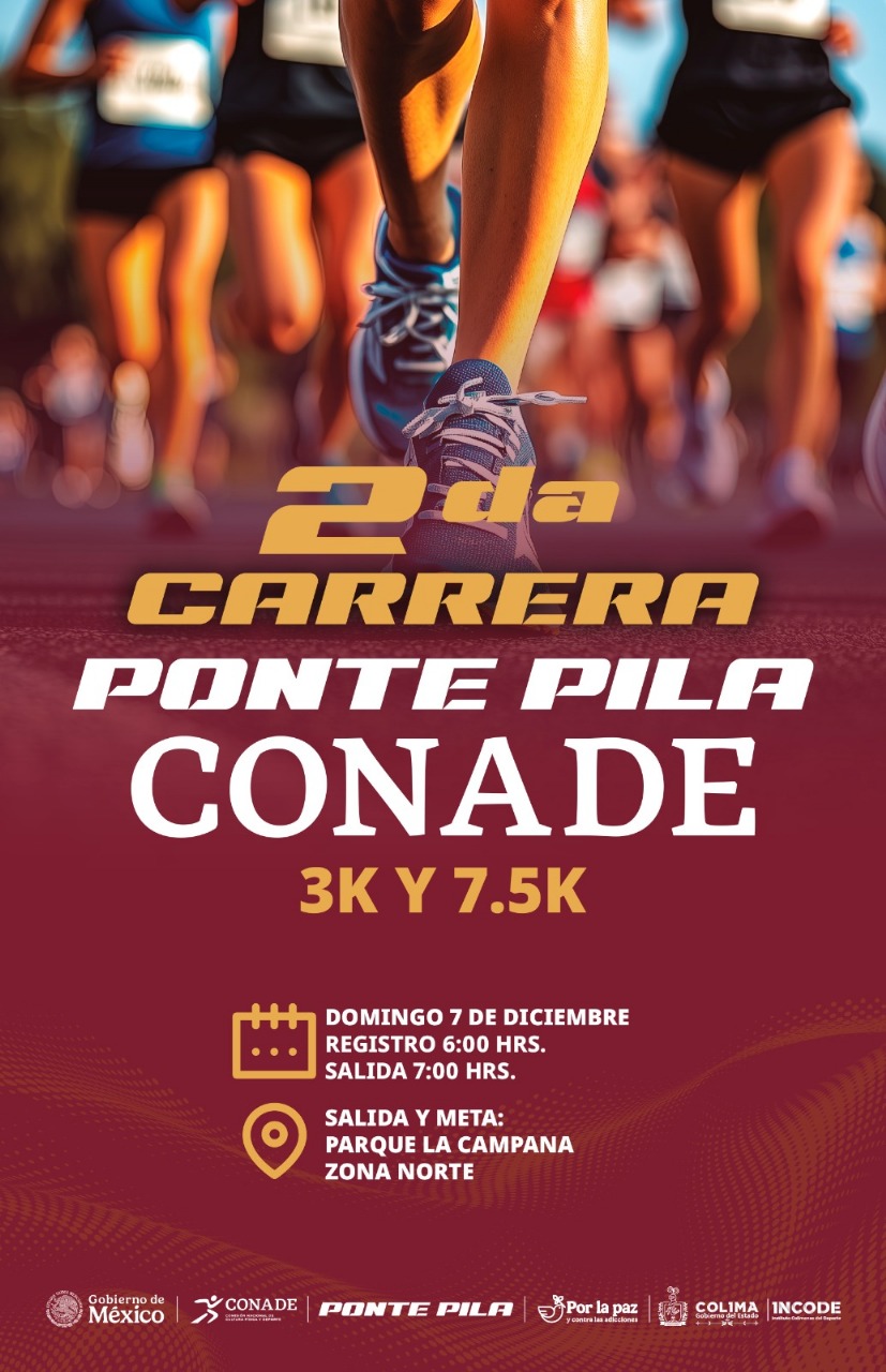 El Gobierno del Estado de Colima, a través del Instituto Colimense del Deporte (Incode), en coordinación con la Comisión Nacional de Cultura Física y Deporte (Conade), invita a la segunda carrera ‘Ponte Pila’ de 3 y 7.5 kilómetros, categoría libre femenil y varonil, el domingo 7 de diciembre a partir de las 7:00 horas, con salida y meta en la entrada norte del Parque Ecológico ‘La Campana’, formando parte de la agenda de actividades de esta área natural protegida, y que las y los participantes disfruten de la naturaleza, haciendo actividad física.