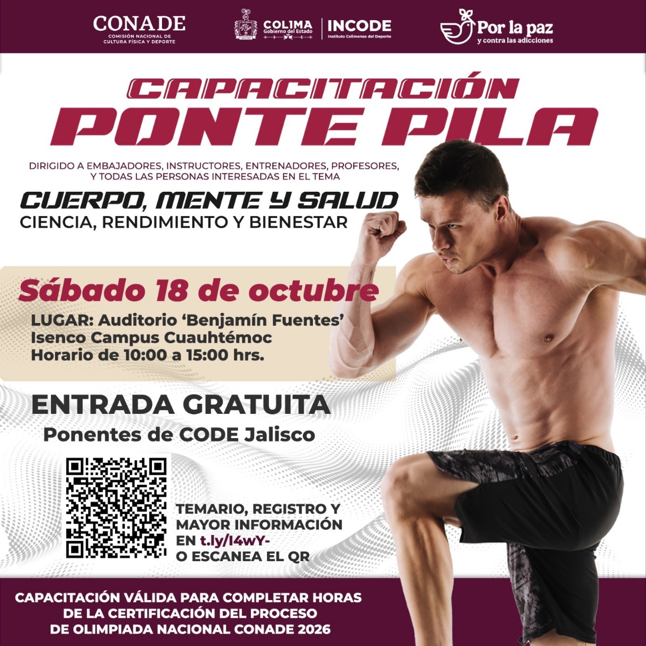 El Gobierno del Estado de Colima, a través del Instituto Colimense del Deporte (Incode), en coordinación con la Comisión Nacional de Cultura Física y Deporte (Conade) y el Consejo Estatal para el Fomento Deportivo del Estado de Jalisco, invitan a participar en la capacitación ‘Cuerpo, Mente y Salud’ del programa de activación física ‘Ponte Pila’, en el auditorio “Benjamín Fuentes González” del Instituto Superior de Educación Normal del Estado de Colima (Isenco) campus Cuauhtémoc, este sábado 18 de octubre, de las 10:00 de la mañana a las 3:00 de la tarde.