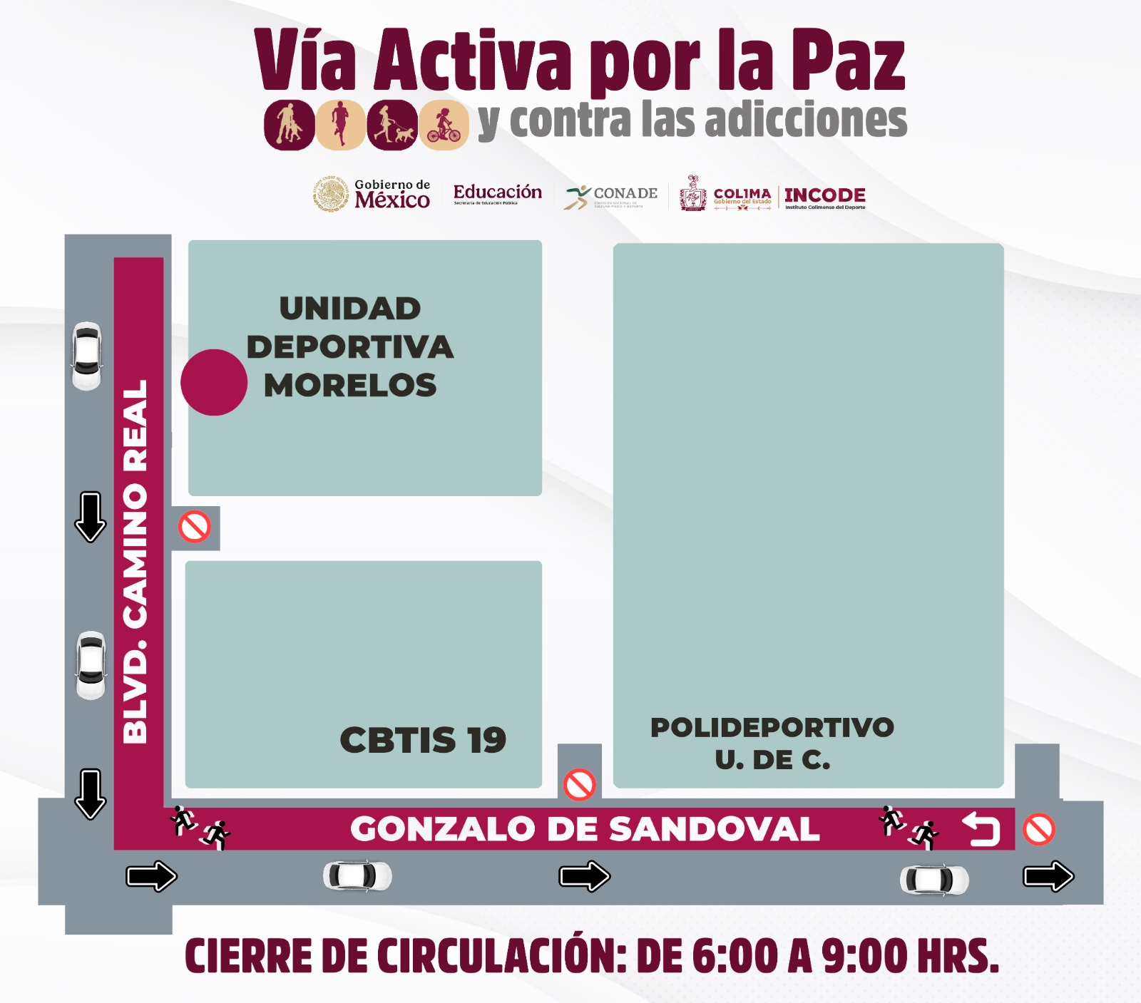 El Incode agrega que con este motivo, a partir de las 6:00 de la mañana, se cerrará la vialidad en avenida Camino Real (dirección norte a sur), a la altura de la unidad deportiva ‘José María Morelos y Pavón’ y la escuela secundaria ‘Manuel Sandoval Vallarta’, así como la avenida Gonzalo de Sandoval, en el carril de oriente a poniente, en el tramo del Polideportivo Universitario y CBTIS 19.