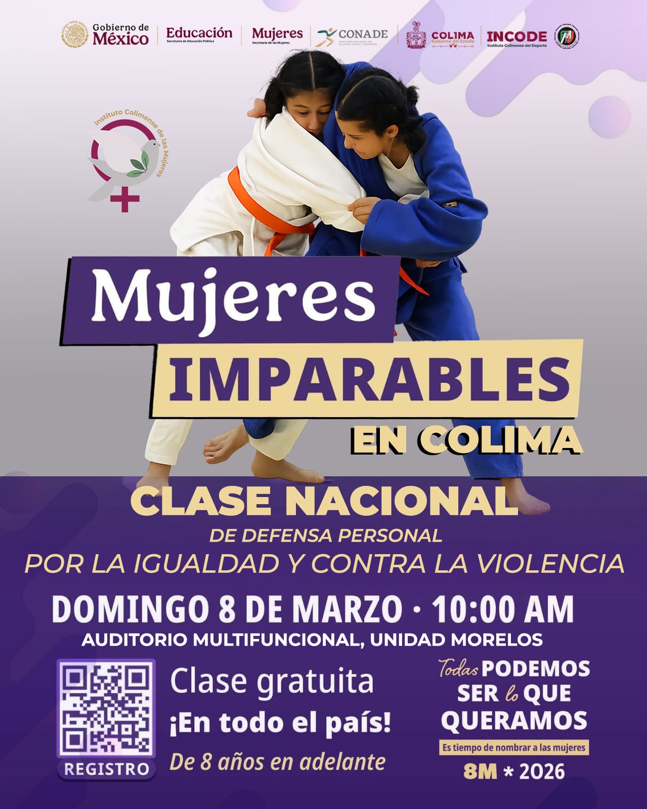 Gobierno de México y Gobierno del Estado de Colima, a través de la Secretaría de Educación Pública y la Secretaría de Mujeres, la Comisión Nacional de Cultura Física y Deporte (Conade), en coordinación con el Instituto Colimense de las Mujeres (ICM) y el Instituto Colimense del Deporte (Incode), invitan a participar en la clase nacional de defensa por la igualdad y contra la violencia ‘Mujeres Imparables’, el domingo 8 de marzo a partir de las 10:00 de la mañana, en el auditorio multifuncional de la unidad deportiva ‘José María Morelos y Pavón’.