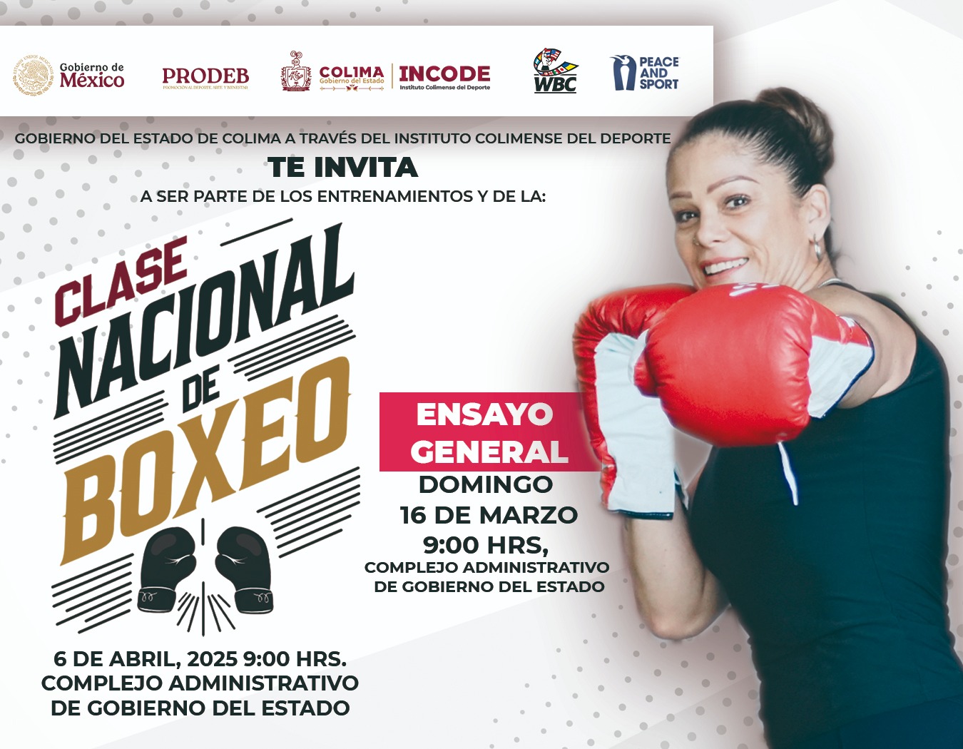El Gobierno del Estado de Colima, a través del Instituto Colimense del Deporte (Incode) invita a organizaciones, colectivos y toda la ciudadanía al ensayo general previo con miras a la realización de la Clase Nacional de Boxeo, a efectuarse este domingo 16 de marzo, en la explanada del Complejo Administrativo del Gobierno del Estado de Colima, a partir de las 9:00 horas, informó el director de la dependencia, Alejandro Rodríguez Alvarado.