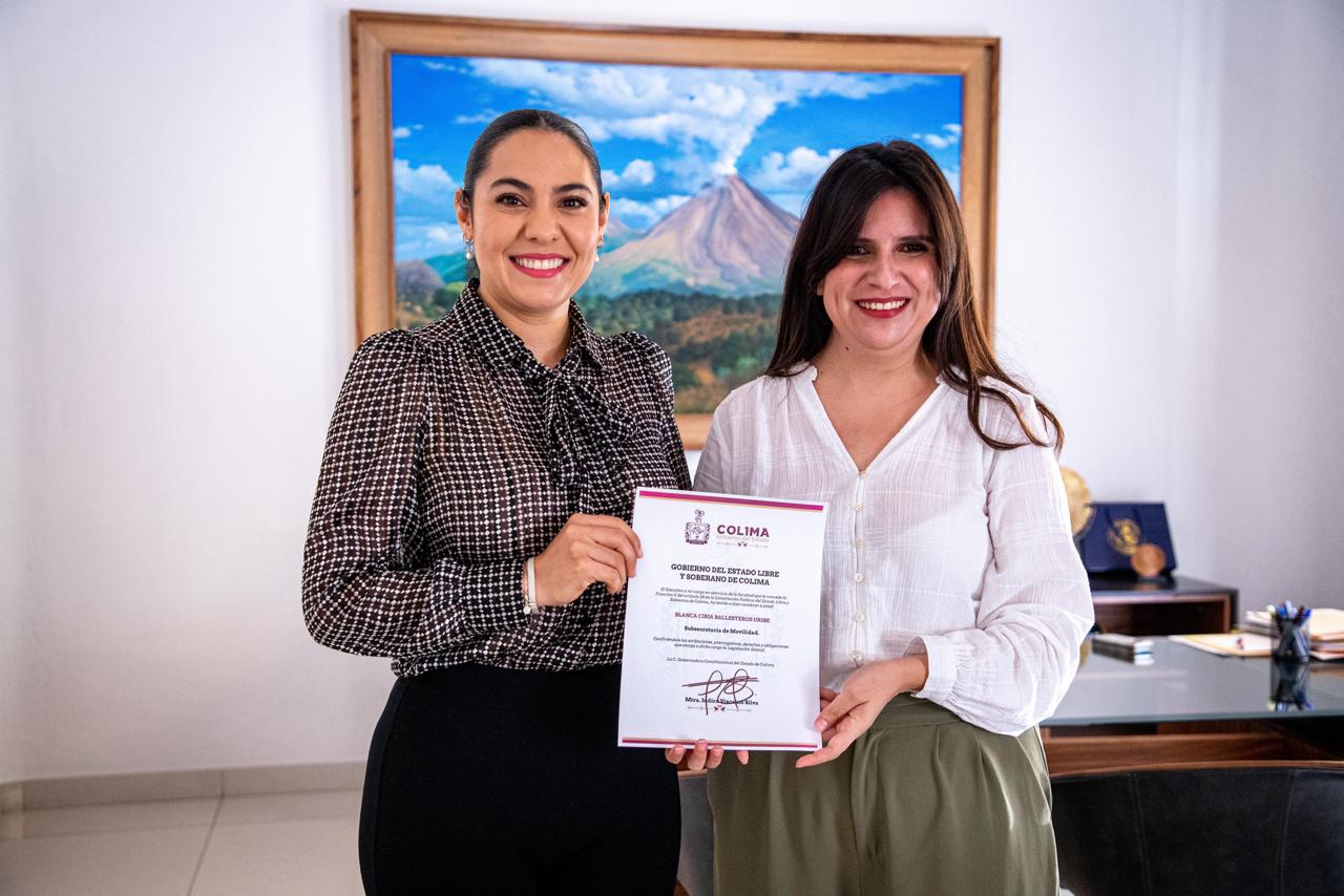 La gobernadora Indira Vizcaíno Silva designó este viernes a Blanca Ciria Ballesteros Uribe como subsecretaría de Movilidad del Gobierno del Estado de Colima; la nueva titular de la Subsemov cuenta con especialización en diseño e implementación de Políticas Públicas, particularmente en transporte público con perspectiva de género.