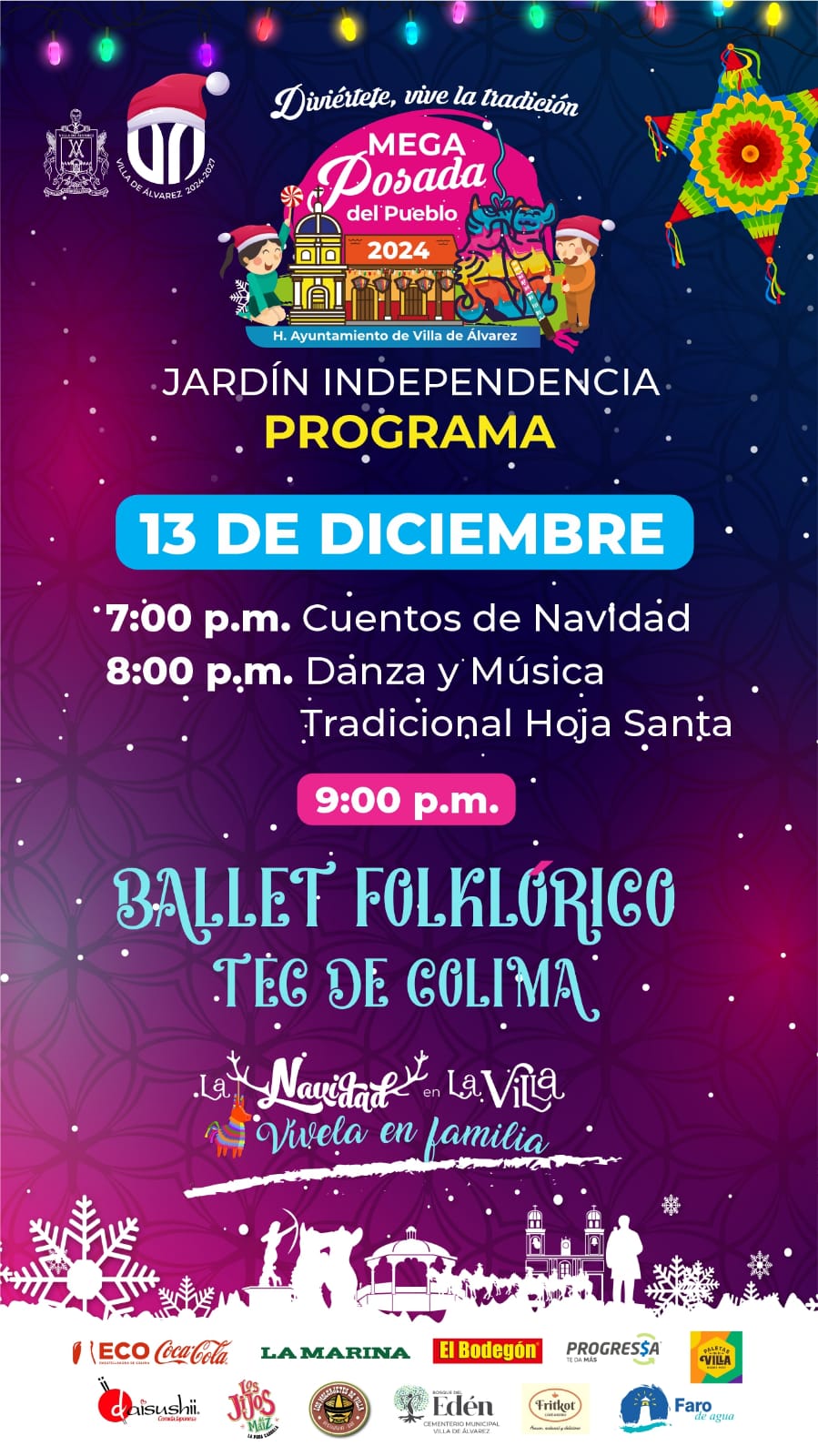 Villa de Álvarez, Col.- Con la presentación estelar del Ballet Folklórico del TEC de Colima, este viernes 13 iniciará la Mega Posada del Pueblo en el Jardín Independencia (Jardín Principa), organizada por el Ayuntamiento de Villa de Álvarez.