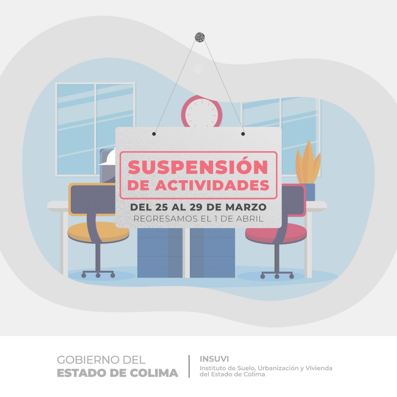 Se informa a las usuarias y los usuarios que, del lunes 25 al viernes 29 de marzo, las oficinas del Instituto de Suelo, Urbanización y Vivienda Instituto de Suelo, Urbanización y Vivienda (Insuvi) del Estado de Colima, suspenderán actividades a trámites y servicios, retomando labores el lunes 1 de abril en el horario habitual, de las 8:30 de la mañana a 3:00 de la tarde.