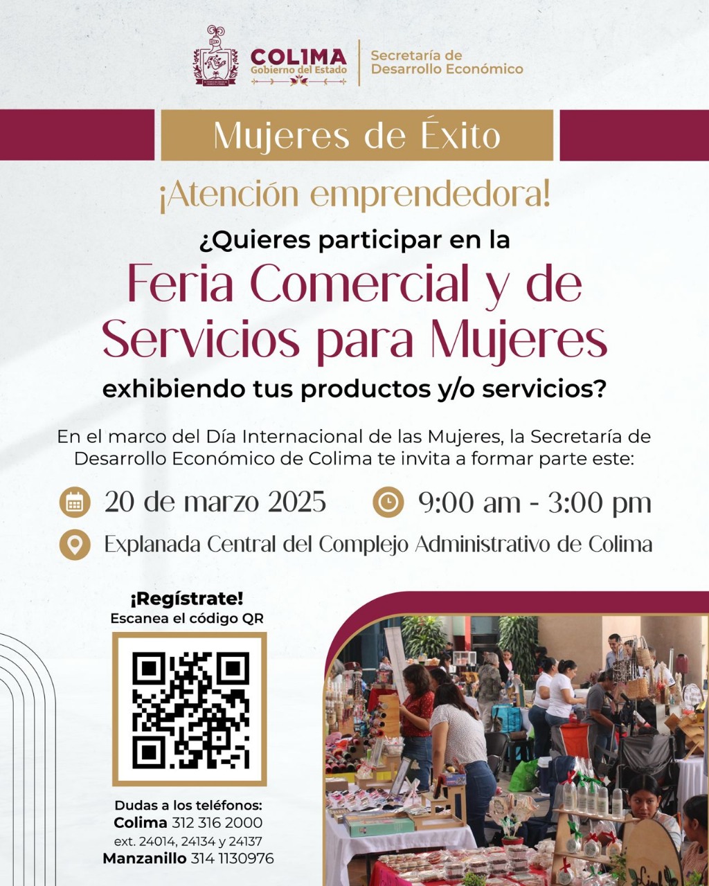 Con el objetivo de impulsar el emprendimiento y fortalecer la participación económica de las mujeres, el Gobierno del Estado de Colima, a través de la Secretaría de Desarrollo Económico (Sedeco), invita a participar en la ‘Feria Comercial y de Servicios para Mujeres’, que se llevará a cabo el jueves 20 de marzo en la explanada del Complejo Administrativo de Colima.
