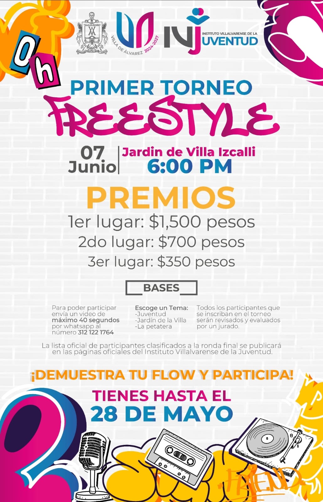 Villa de Álvarez, Col.- El Ayuntamiento de Villa de Álvarez que encabeza Tey Gutiérrez Andrade, en coordinación con el Instituto Villalvarense de la Juventud, emitió la convocatoria para participar en el Primer Torneo Freestyle que se llevará a cabo el próximo 7 de junio en el Jardín de Villa Izcalli, a partir de las 6 de la tarde.