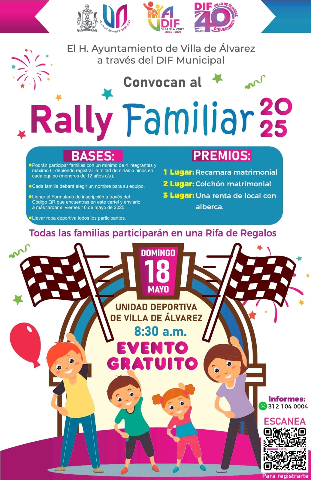 Villa de Álvarez, Col.- El Ayuntamiento de Villa de Álvarez, a través del DIF Municipal, emitió la convocatoria para el Rally Familiar, el cual se realizará este domingo 18 de mayo en la Unidad Deportiva “Profesor Gil Cabrera Gudiño”, a partir de las 8:30 de la mañana.