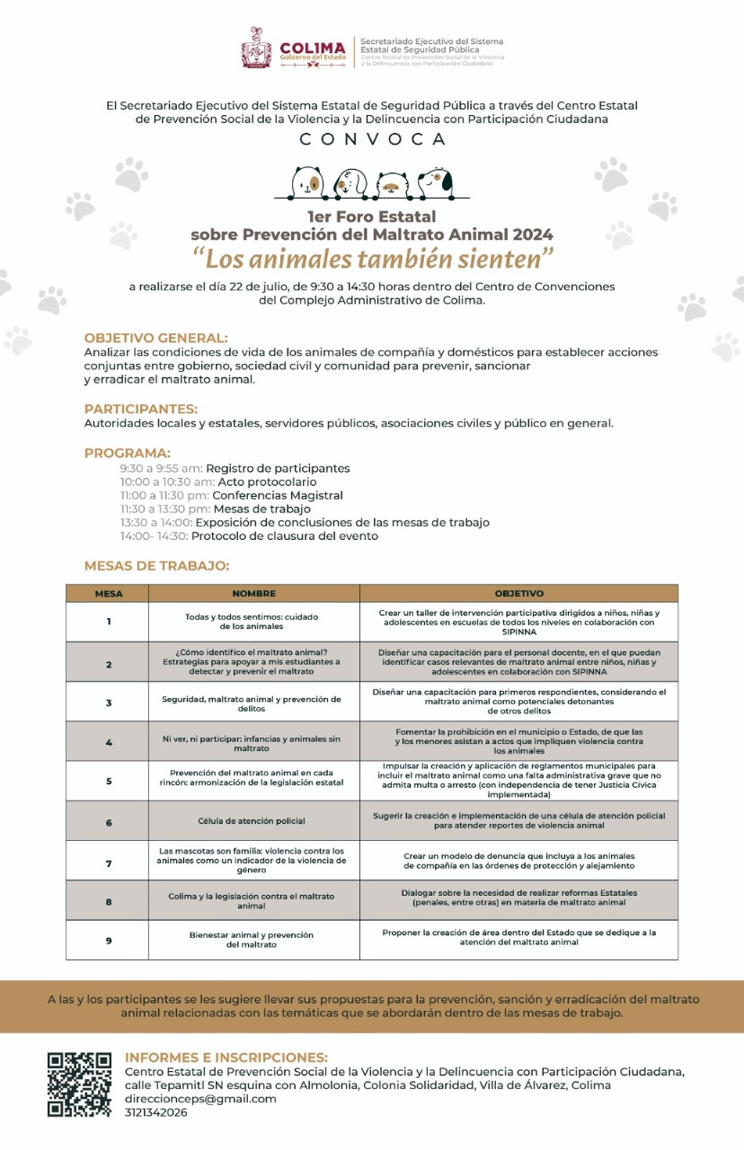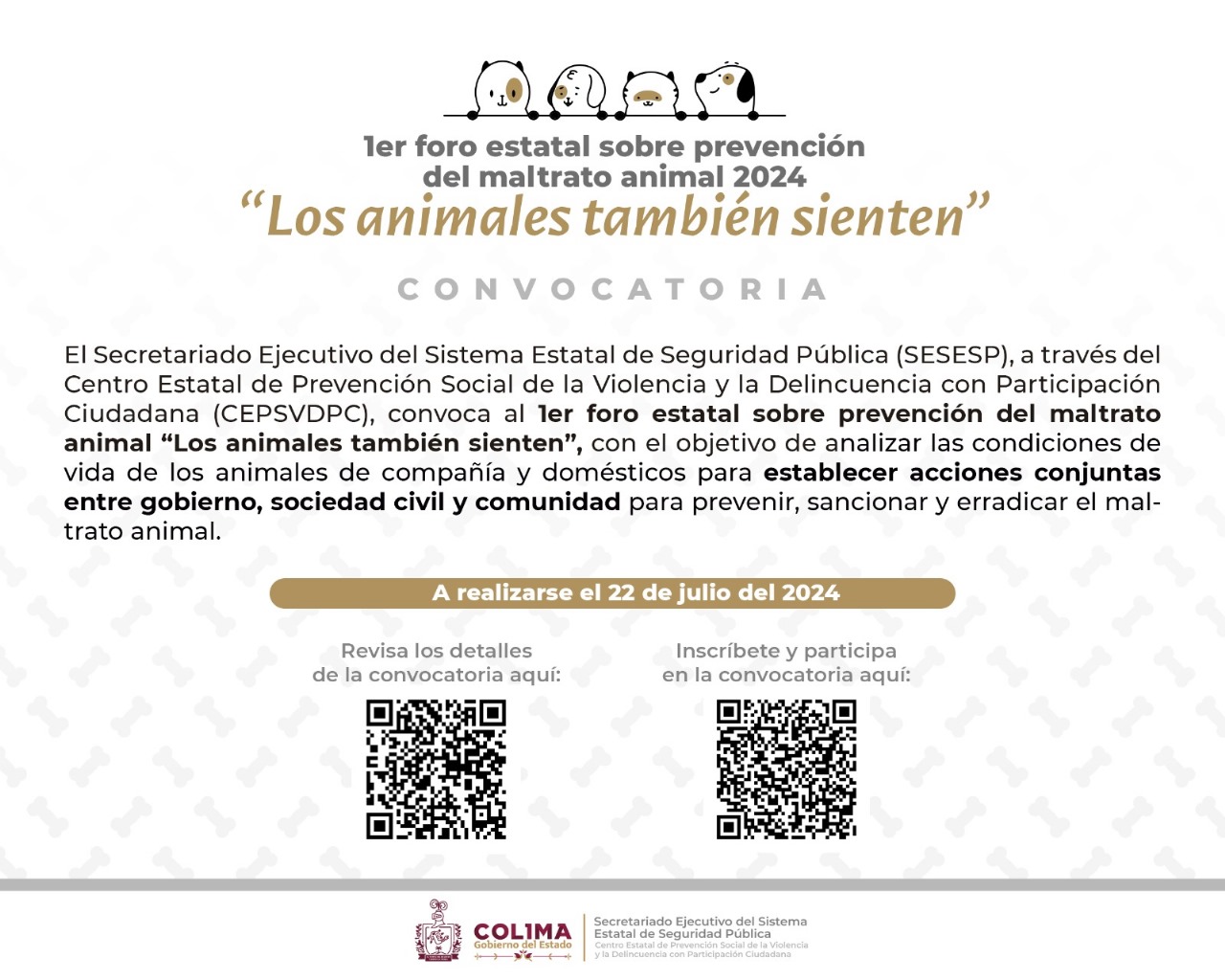 El próximo lunes 22 de julio se llevará a cabo el primer Foro sobre Prevención del Maltrato Animal 2024 ‘Los animales también sienten’, de 9:30 a 14:30 horas en el Centro de Convenciones en Colima, que es organizado por el Secretariado Ejecutivo del Sistema Estatal de Seguridad Pública (SESESP), a través del Centro de Prevención Social de la Violencia y la Delincuencia con Participación Ciudadana.