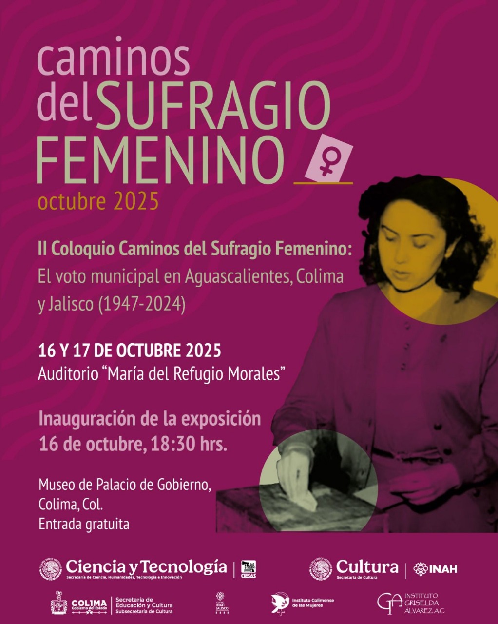 El Centro de Investigaciones y Estudios Superiores en Antropología Social (CIESAS Occidente), en coordinación con la Subsecretaría de Cultura del Gobierno del Estado de Colima, organizan e invitan al II Coloquio Caminos del Sufragio Femenino: el voto municipal en Aguascalientes, Colima y Jalisco (1947-2024) que se realizará 16 y 17 de octubre en el Museo Palacio de Gobierno, en el marco del 70 aniversario de las primeras elecciones en que participaron las mujeres mexicanas, para conmemorar la lucha por la conquista de este derecho universal.