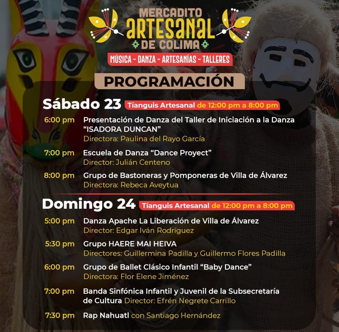 Para el domingo 24 de marzo, en los mismos horarios, además de la exhibición y venta de artesanías tradicionales, habrá presentaciones de la danza apache de Villa de Álvarez, del Grupo Haere Mai Heiva, ballet clásico infantil, la Banda Sinfónica Infantil y Juvenil del Estado, y un concierto de rap en lengua náhuatl.