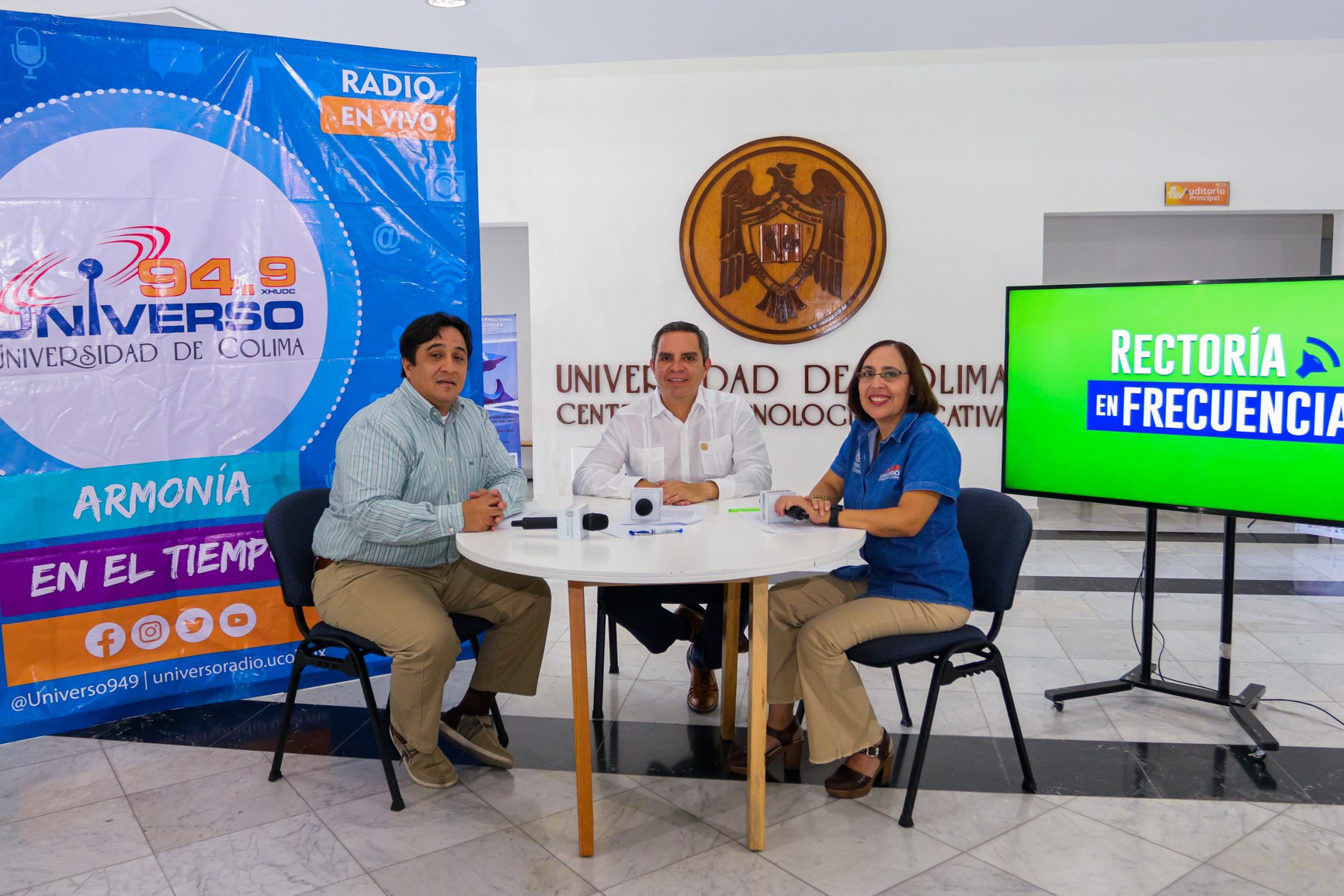 Desde el Centro de Tecnología Educativa del campus El Naranjo de la Universidad de Colima, en Manzanillo, se transmitió el programa “Rectoría en Frecuencia”, con la participación del rector Christian Jorge Torres Ortiz Zeremeño y conducido por José Ferruzca y Marina Vázquez, director de El Comentario y directora de Universo 94.9, respectivamente.