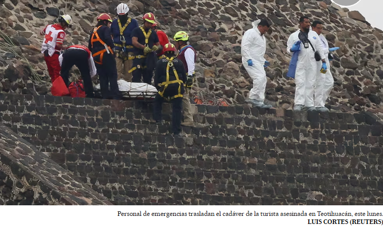 Un solo hombre con un arma corta tiene sometidas a decenas de personas en lo alto de la Pirámide de la Luna, en la concurrida zona arqueológica de Teotihuacán (Estado de México). Entre la gente aterrorizada hay muchos turistas extranjeros. En los vídeos que han saltado a las redes se los ve pecho en tierra u ocultos detrás de las piedras que sobresalen de la propia pirámide. El asesino ―que mató a una persona de nacionalidad canadiense― se pasea con parsimonia en esa altura que ha elegido como escenario. Parece consciente de que lo observan, lo graban, lo temen. Todo el mundo petrificado mientras el atacante, identificado como Julio César Jasso Ramírez, de 27 años, camina hacia su equipaje, se agacha, extrae probablemente cartuchos, y luego, arma en mano, un revólver calibre .38, regresa hacia donde están postradas las que serán sus víctimas.