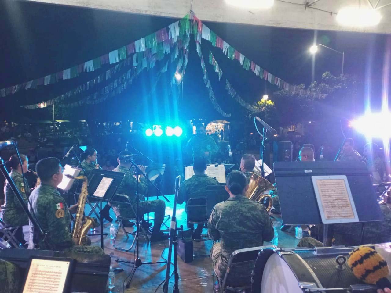 Colima, Col., a 23 de septiembre de 2023.- La Secretaría de la Defensa Nacional a través de la Comandancia de la V Región Militar y 20/a. Zona Militar, hace del conocimiento a la población que la noche del 22 de septiembre en el marco de las Fiestas Patronales de Quesería, la Banda de Música de la V Región Militar realizó una presentación musical, interpretando piezas musicales como Mexico Lindo, Camino Real de Colima, Marcha Radetzky, Juarez y La Constitution, entre otras.