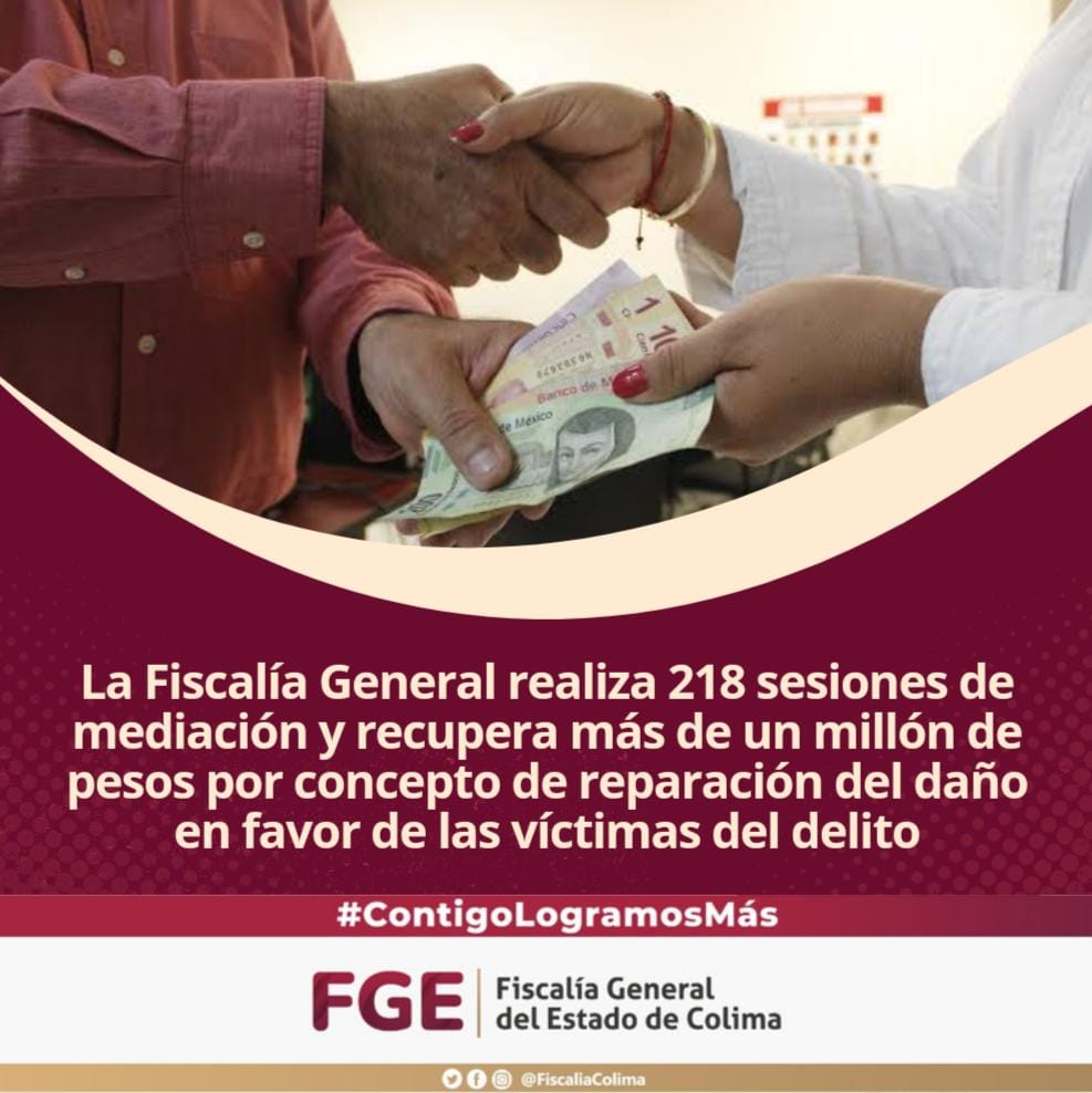 Por su parte, la Dirección de Soluciones Alternas celebró 96 acuerdos reparatorios, logrando recuperar la cantidad de $1´016,550.00 (un millón dieciséis mil quinientos cincuenta pesos 00/100 M.N.) por concepto de la reparación del daño en favor de las víctimas del delito, realizando además, 218 sesiones de mediación, tan solo en los municipios de Colima, Manzanillo, Villa de Álvarez y Tecomán.