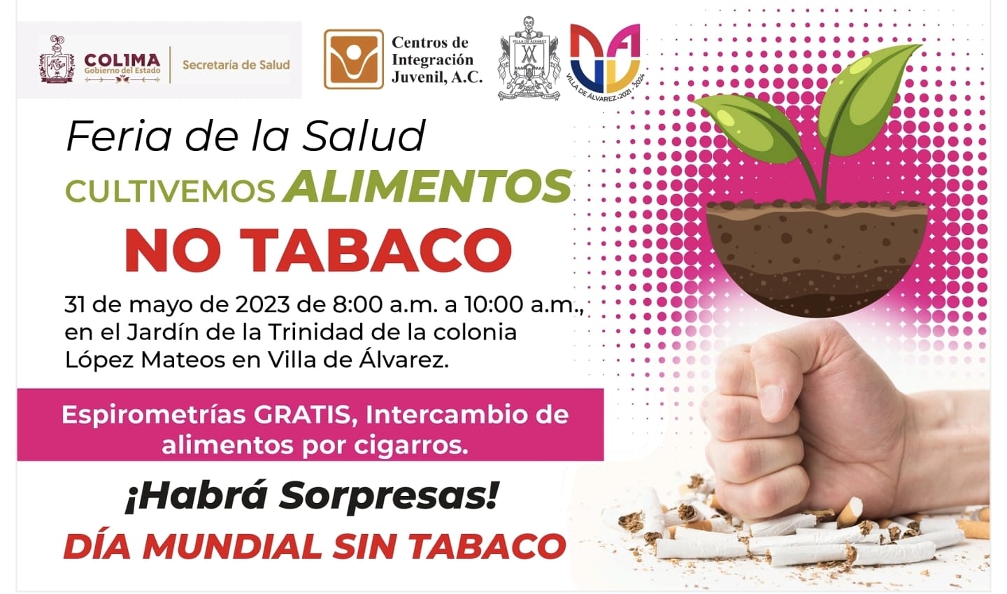 Villa de Álvarez, Col.- En el marco del Día mundial sin tabaco que se celebrará el 31 de mayo, el Ayuntamiento de Villa de Álvarez se sumó a la campaña Feria de la Salud “Cultivemos Alimentos no Tabaco”.