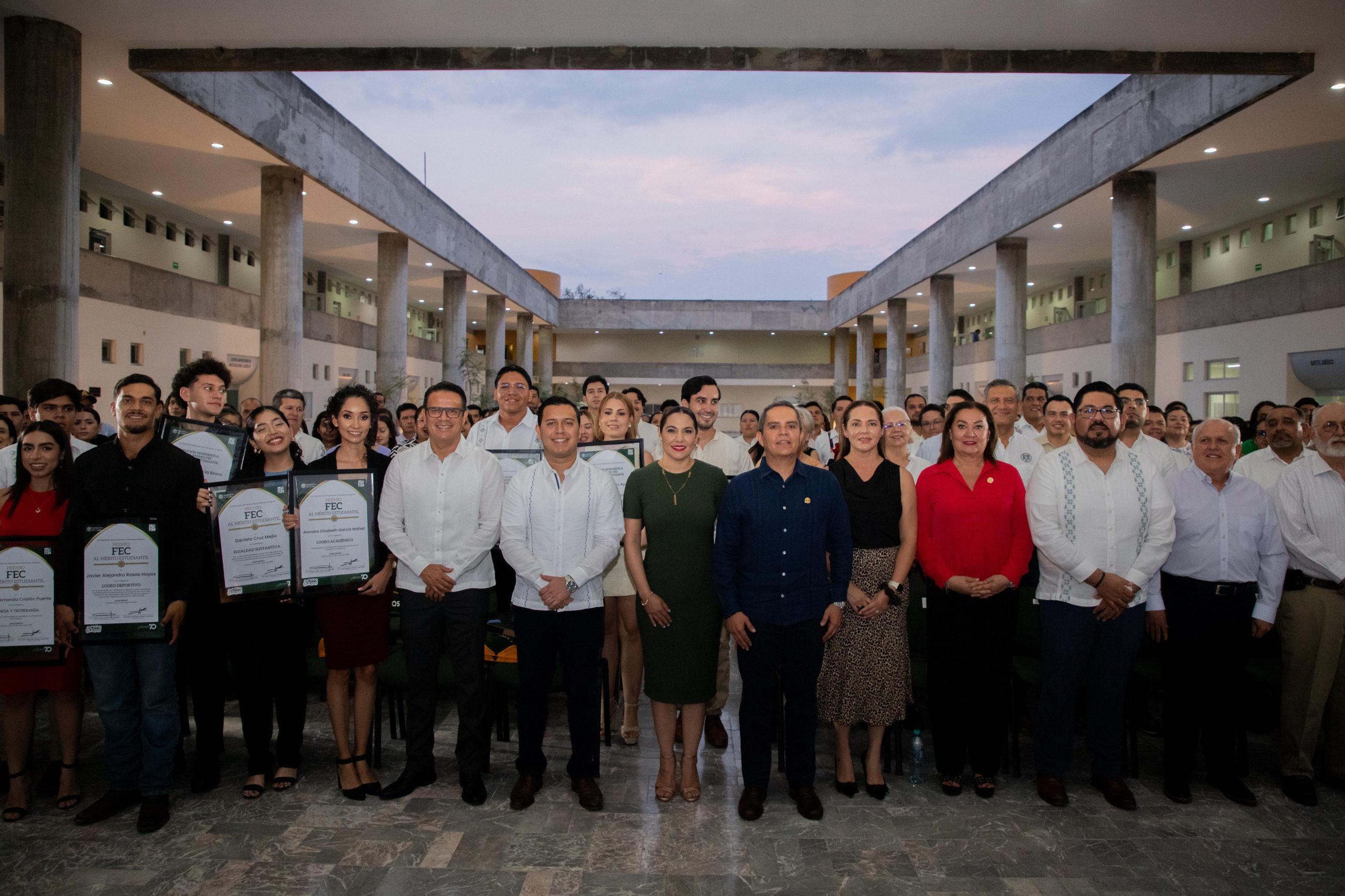 La gobernadora Indira Vizcaíno Silva asistió a la entrega del Premio de la Federación de Estudiantes Colimenses (FEC) al Mérito Estudiantil 2025, la tarde de este martes en la explanada de la Facultad de Derecho de la Universidad de Colima; la mandataria dijo a las y los jóvenes galardonados que cada paso que dan, influye en ellos y en la sociedad.