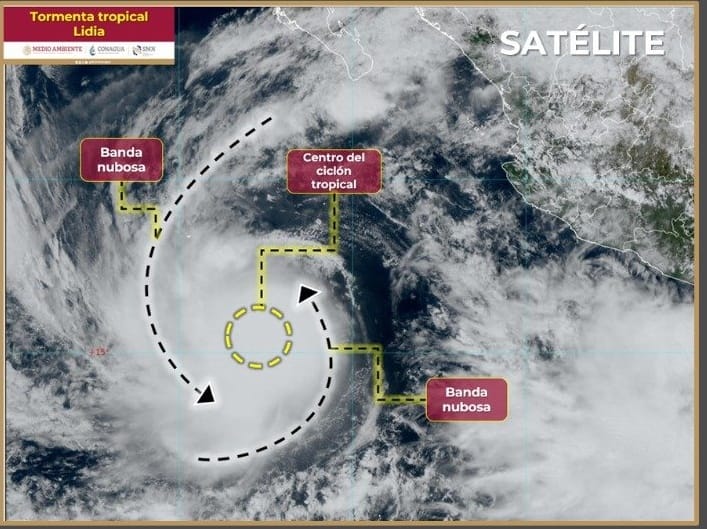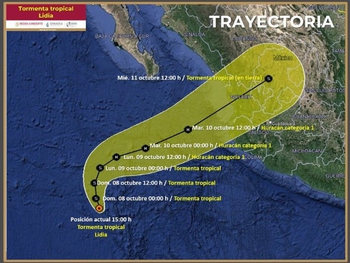 El centro de la tormenta tropical ‘Lidia’ se ubicó la tarde de este sábado a 925 kilómetros al oeste-suroeste de Manzanillo y durante las próximas horas su amplia circulación ocasionaría lluvias puntuales de muy fuerte a intensas y oleaje de uno a tres metros en costas de Colima y Jalisco, con precipitaciones fuertes también en Sinaloa y Nayarit, informó el Servicio Meteorológico Nacional (SMN).