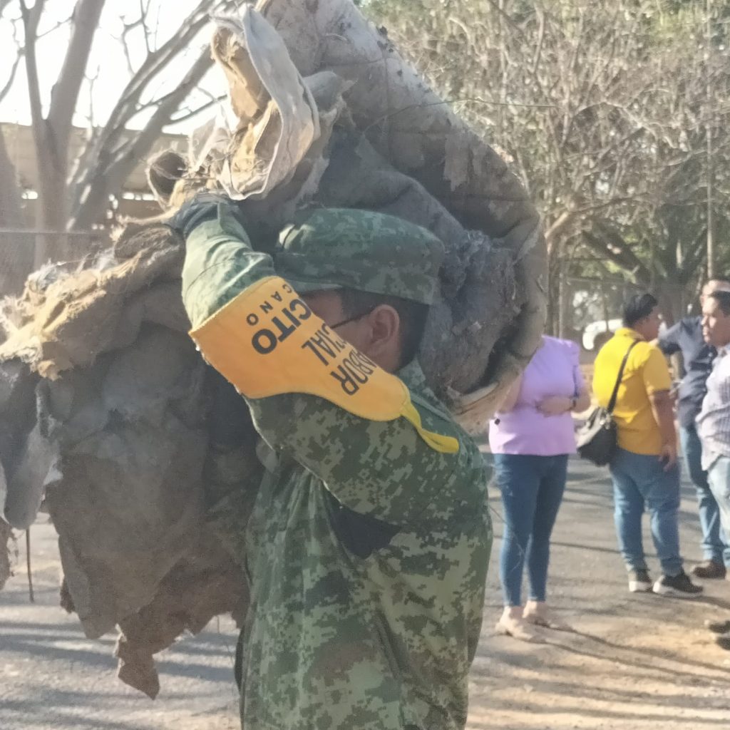 La limpieza y rescate de esa zona de la Ciudad de Villa de Álvarez se realizó con el apoyo de 92 trabajadores y trabajadoras del municipio, 62 efectivos del Ejército Mexicano, 25 del Gobierno del Estado y 15 vecinas y vecinos del lugar.