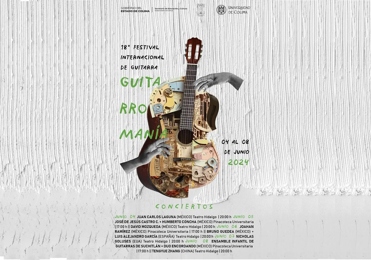 Del 4 al 8 de junio, la Universidad de Colima, a través del Instituto Universitario de Bellas Artes (IUBA), el Cuerpo Académico 108 “Educación, Gestión cultural y Producción artística”, y con el apoyo de la Coordinación General de Extensión y la Dirección General de Difusión Cultural, invita a la 18ª edición del Festival Internacional Guitarromanía.