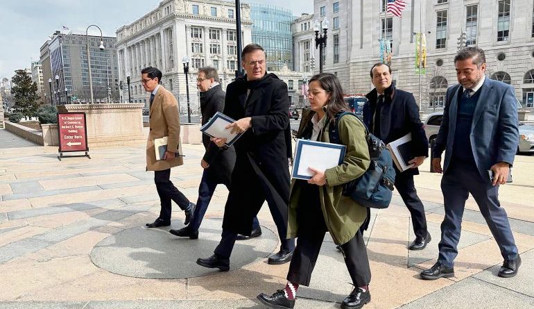 Ebrard acompañó su mensaje con una foto en la que se le ve caminando en Washington con una carpeta con documentos, acompañado por miembros de la delegación mexicana.