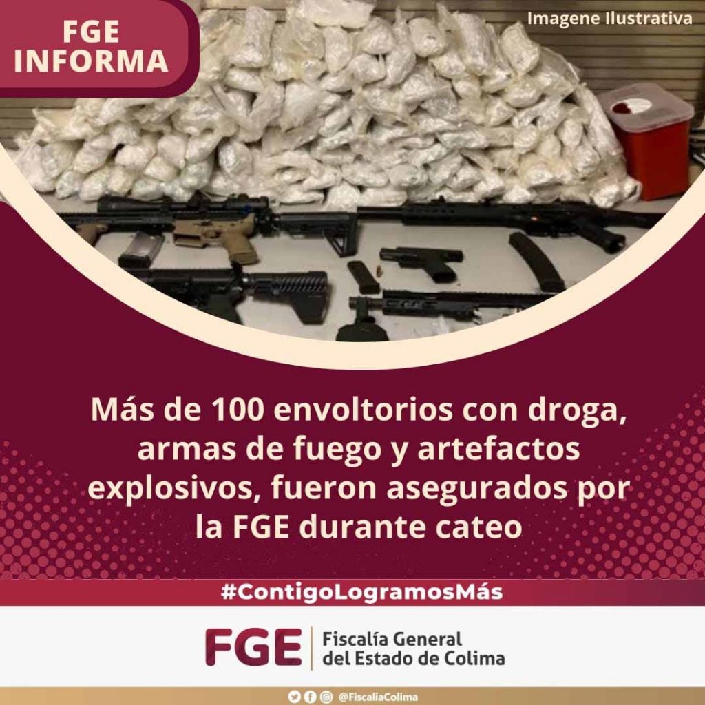 La Policía Investigadora de la Fiscalía General del Estado (FGE) el pasado martes 09 de mayo del presente año, dio cumplimiento a un ordenamiento judicial girado por un Juez de Control por el delito de contra la salud en la modalidad de narcomenudeo, donde se encontraron más de 100 envoltorios con metanfetamina, armas de fuego, artefactos explosivos, entre otros indicios; esto, en esta ciudad de Colima.