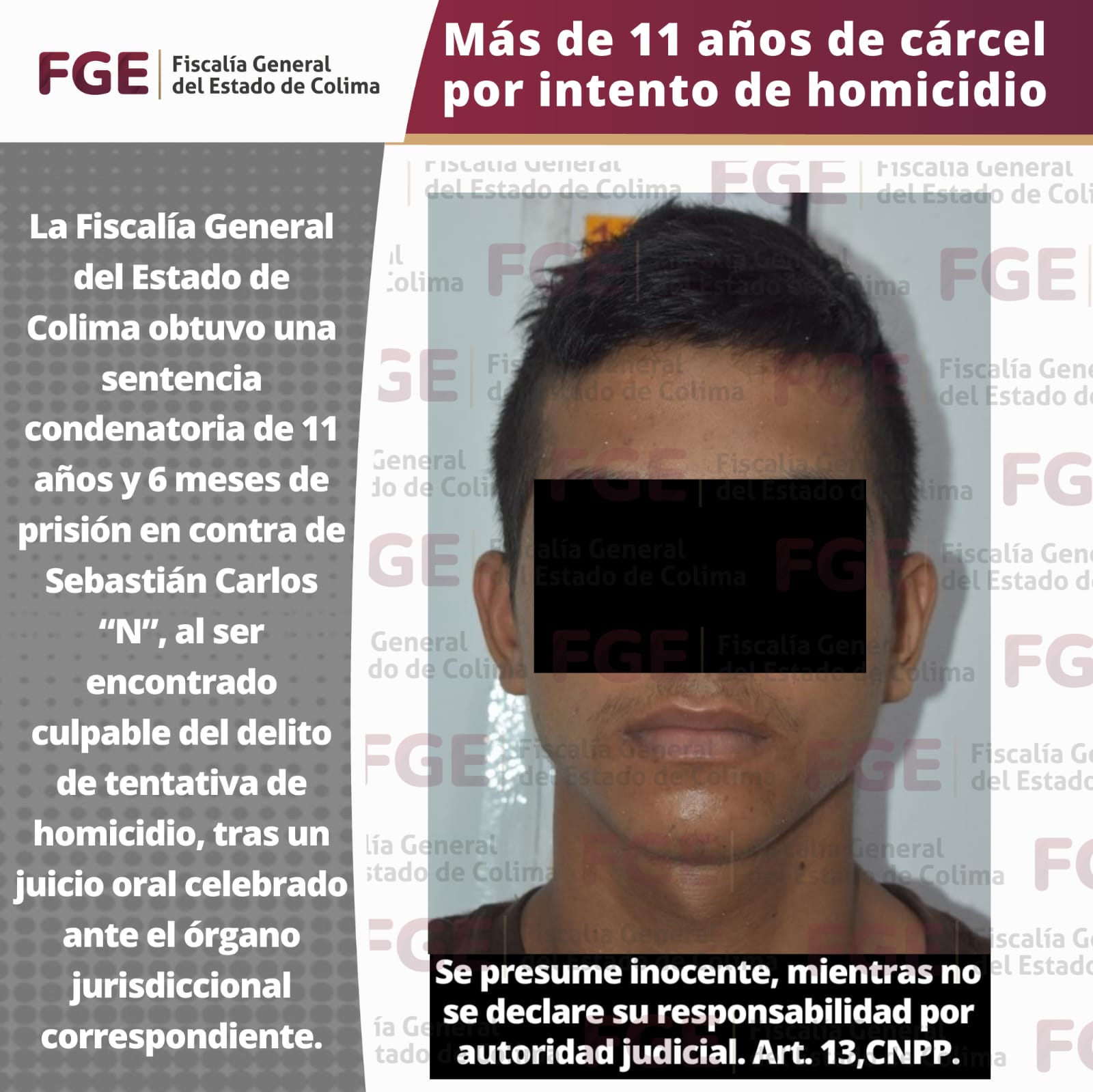 La Fiscalía General del Estado de Colima obtuvo una sentencia condenatoria de 11 años y 6 meses de prisión en contra de Sebastián Carlos “N”, al ser encontrado culpable del delito de tentativa de homicidio, tras un juicio oral celebrado ante el órgano jurisdiccional correspondiente.