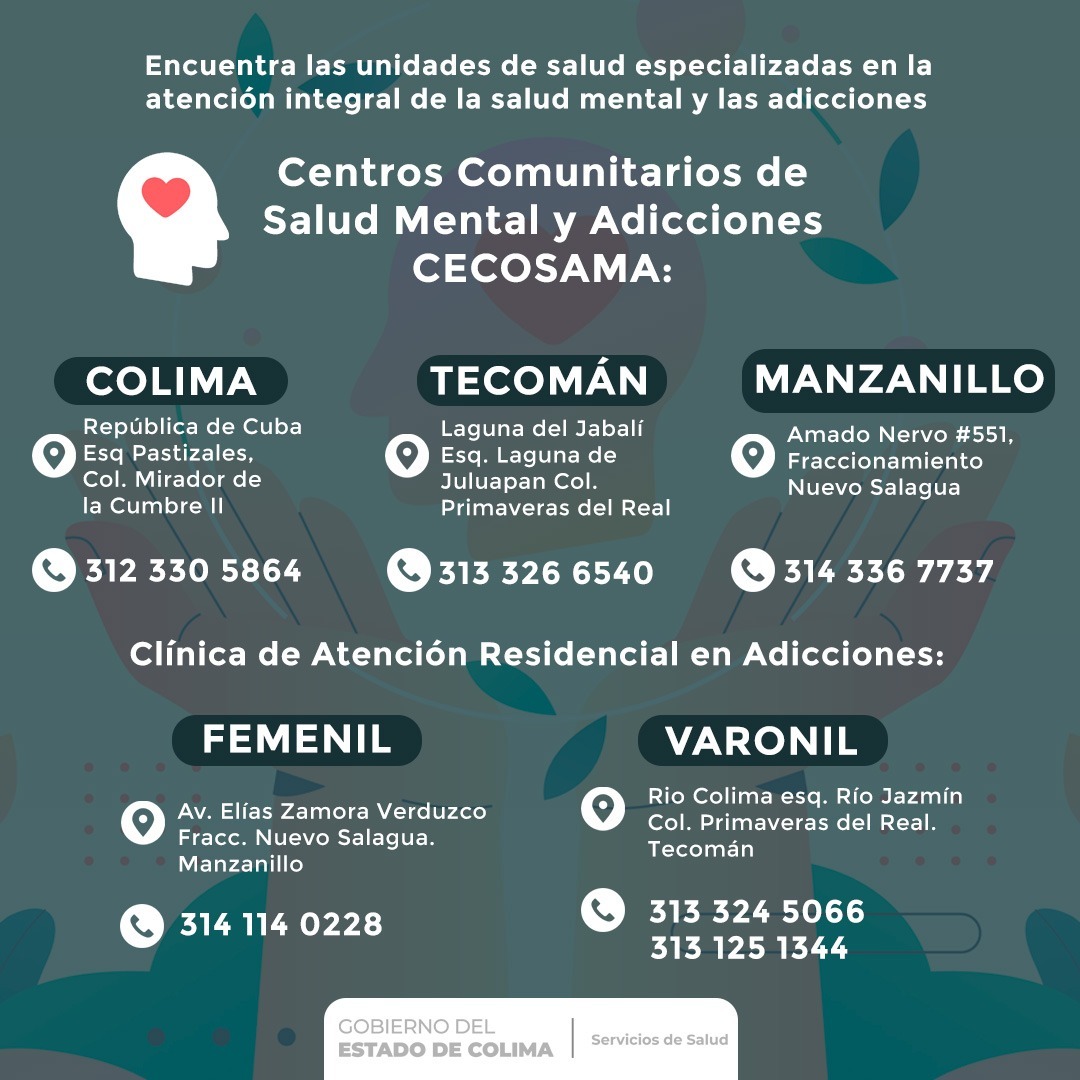 En los Centros Comunitarios de Salud Mental y Adicciones que se encuentran en Colima, Tecomán y Manzanillo, se otorga la atención de los problemas de salud mental de la población colimense.