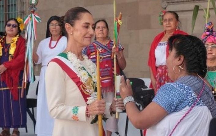 Durante un ritual realizado por mujeres representantes de los pueblos originarios y afromexicanos del norte, sur, oriente y del occidente, y del centro del país, la primera Presidenta de México recibió el Bastón de Mando y Servicio, por parte de 70 comunidades indígenas y afromexicanas del país.