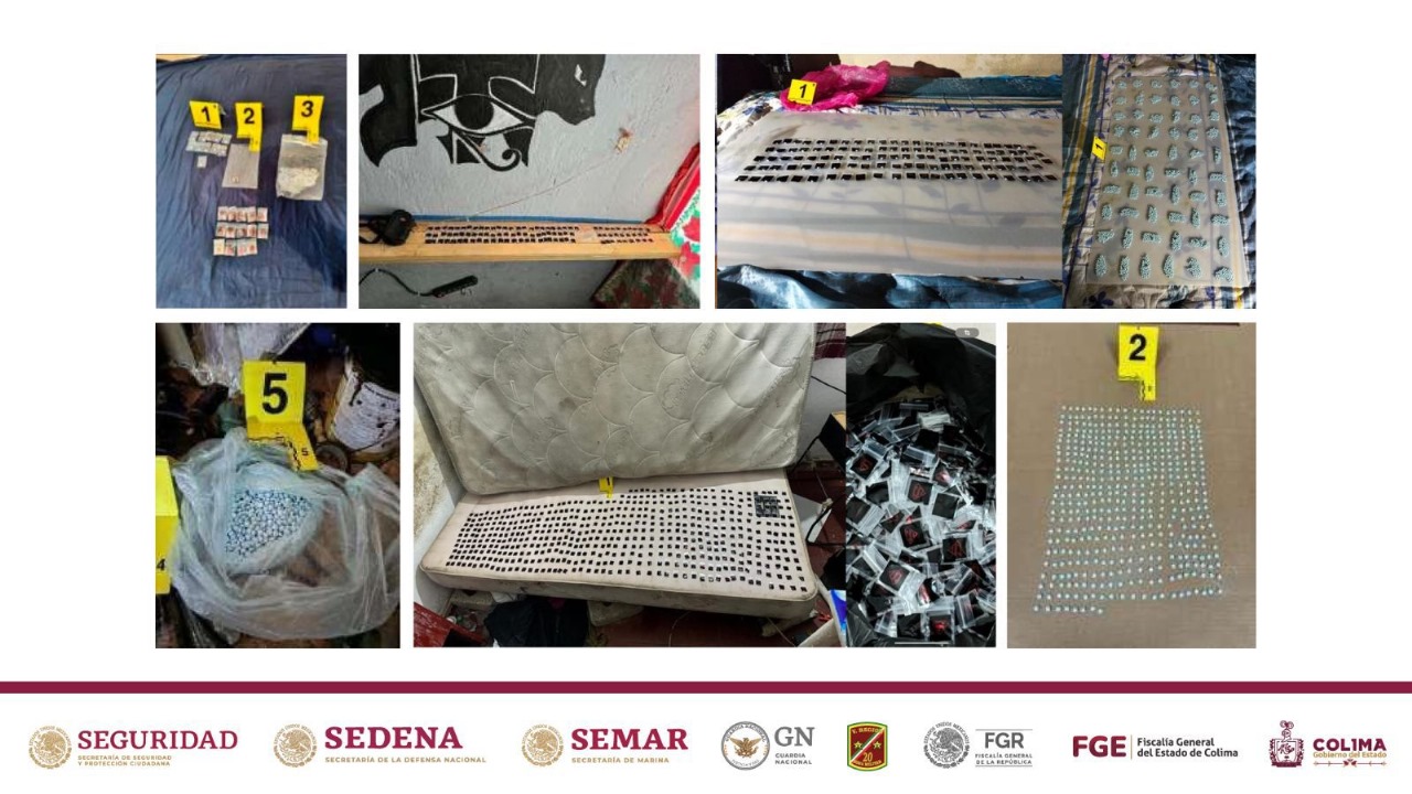 La Mesa de Coordinación Estatal para la Construcción de la Paz y Seguridad en el Estado de Colima informa que, resultado de varios cateos realizados en semanas recientes en el municipio de Manzanillo, se ha logrado el aseguramiento de más de 8 mil pastillas de fentanilo, así como otros indicios.