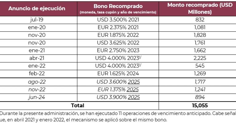 “El día de hoy, la Secretaría de Hacienda y Crédito Público inicia un proceso de vencimiento anticipado de un bono con vencimiento en abril de 2025 por un monto total en circulación de 894 millones de dólares, lo que implica una reducción de la deuda externa para liberar presiones de pago para la siguiente administración”, indicó la dependencia en un comunicado.