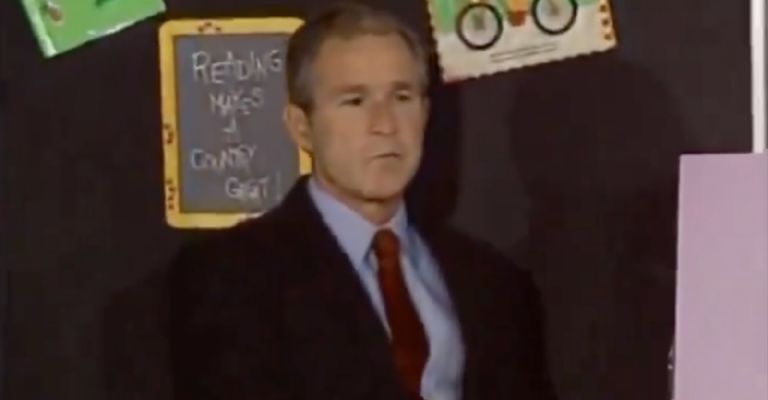 En el video se ve como Bush, quien llevaba ocho meses a cargo del país, estaba en la escuela primaria Emma E. Booker de Sarota, en el Estado de Florida, cuando un jefe de su gabinete se le acercó para susurrarle algo al oído.