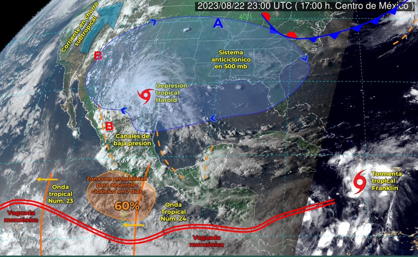 El Servicio Meteorológico Nacional (SMN), prevé que para este miércoles 23 de agosto, en algunos municipios de Colima puedan registrarse fuertes precipitaciones con puntuales muy fuertes de hasta 75 milímetros, lo mismo para el sur de Jalisco, Chihuahua, Puebla y Tabasco.
