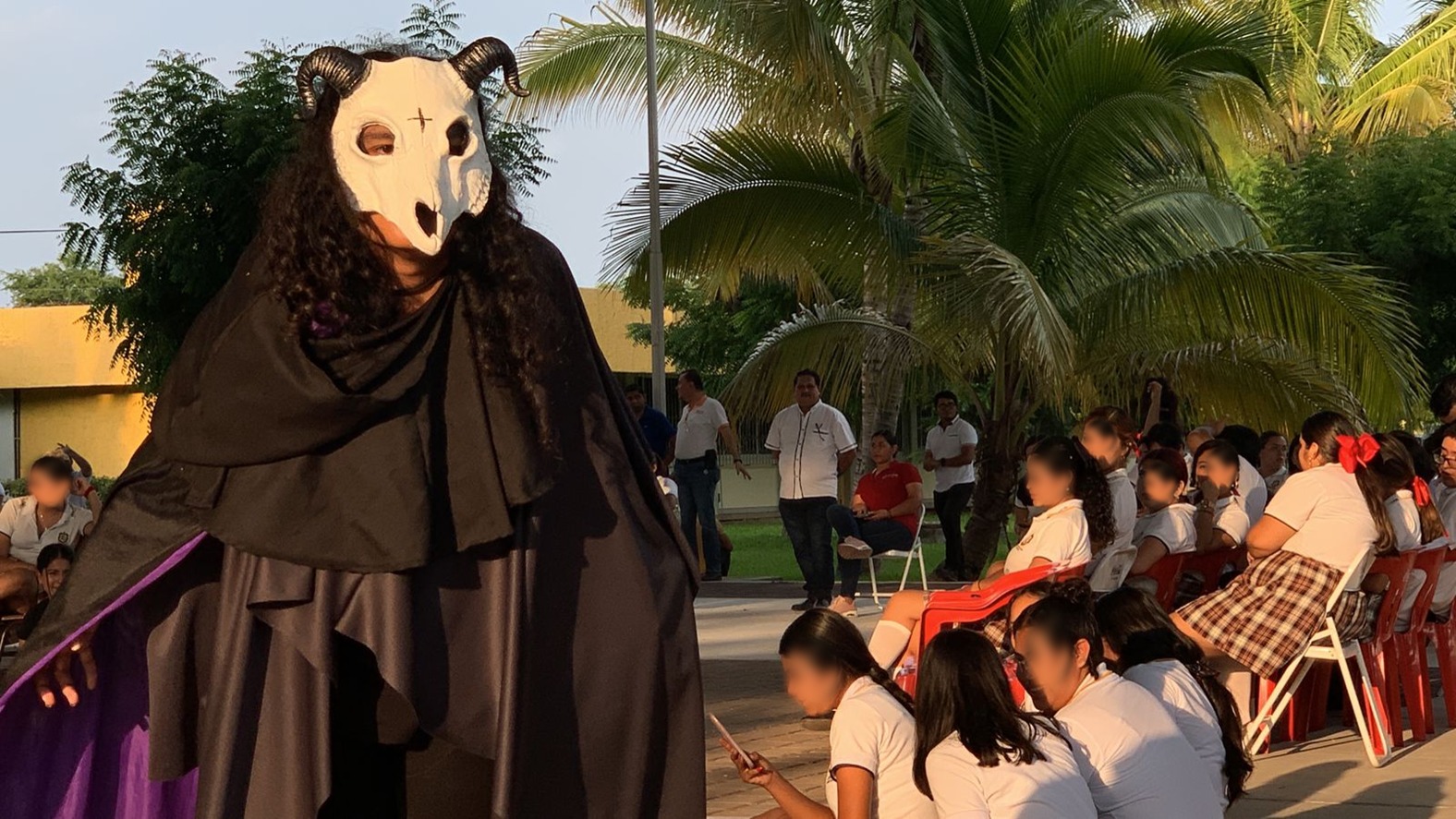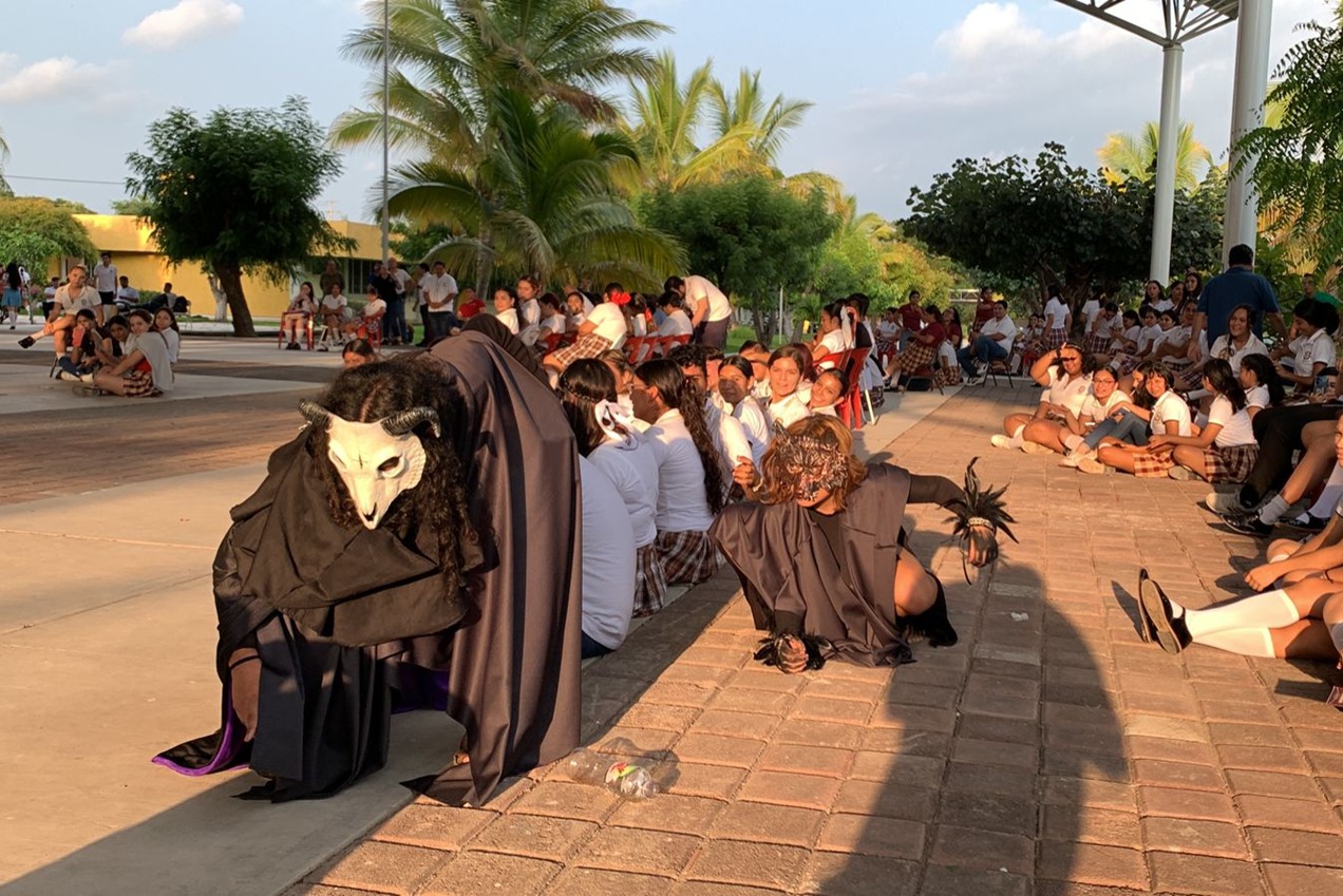 Este miércoles, alumnas y alumnos del turno vespertino del Isenco Cuauhtémoc disfrutaron este espectáculo de música del género metal, que conjuga elementos de la cultura prehispánica de nuestra región, mitos, leyendas y canciones que cuentan con extractos de sus letras cantadas en lenguas originarias.