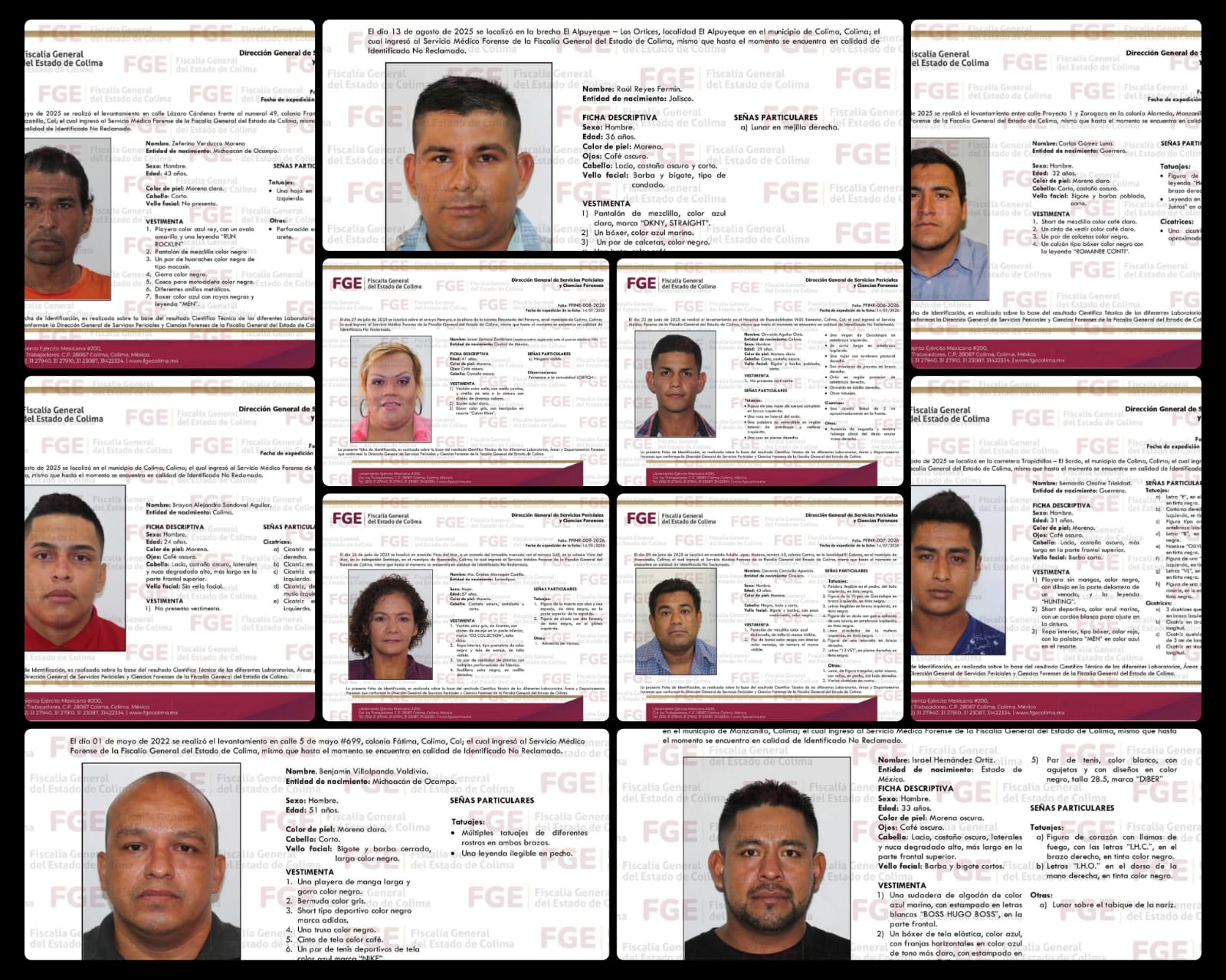 En su página web, la Fiscalía General del Estado (FGE) difundió once nuevas fichas, de cuerpos identificados que están en el Servicio Médico Forense (Semefo), sin embargo no han sido reclamados por sus familias a la fecha.