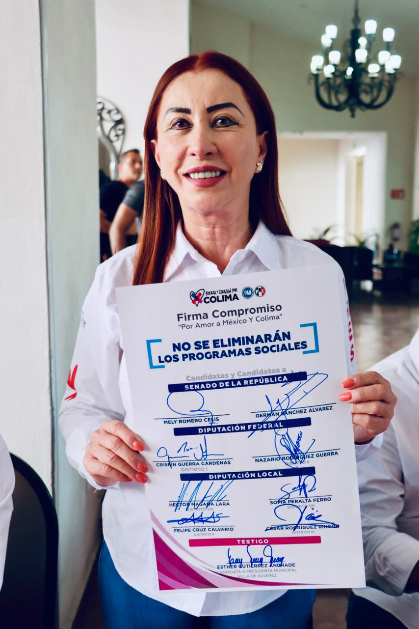 Villa de Álvarez, Col.- Durante el evento de la firma-compromiso por Amor a México y Colima, para garantizar la conservación de los programas sociales, en la que participaron candidatos de la Coalición Fuerza y Corazón por México y por Colima, Tey Gutiérrez, candidata a la Presidencia de Villa de Álvarez, aseguró que es falso lo dicho por los partidos de cuarta respecto a ese tema.