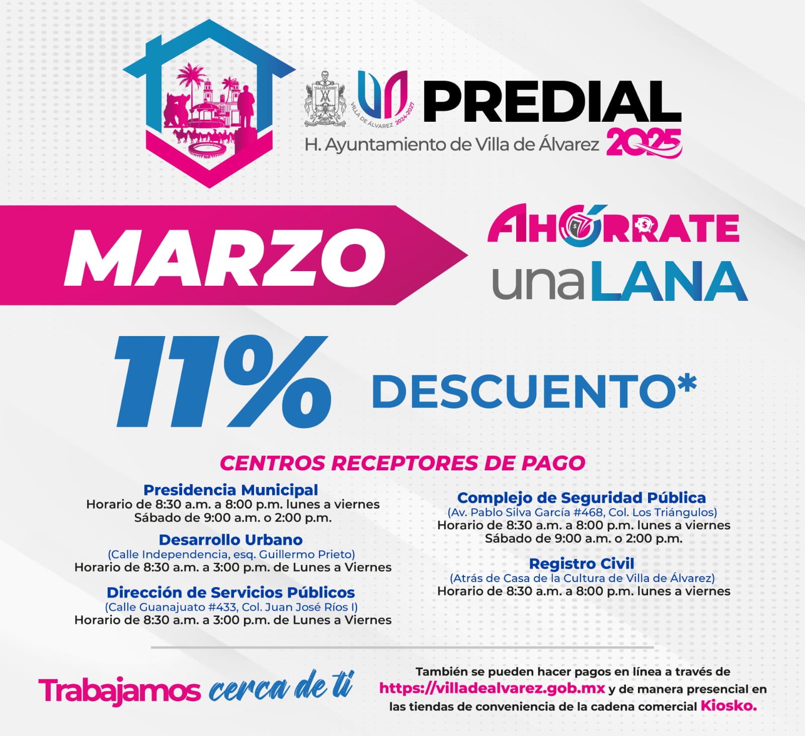 Villa de Álvarez, Col.- A partir de este sábado primero de marzo y durante todo el mes, el Ayuntamiento de Villa de Álvarez ofrece un descuento del 11 por ciento a los contribuyentes del Impuesto Predial que paguen por adelantado el gravamen correspondiente al año 2025.