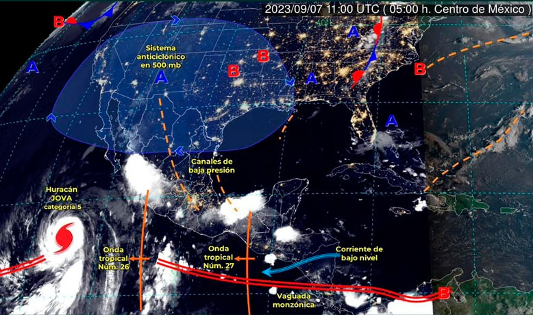 Hoy jueves 7 de septiembre, la onda tropical número 26 se desplazará al suroeste de las costas de Colima y Jalisco, aunada al ingreso de humedad del Océano Pacífico, ocasionarán lluvias puntuales fuertes a muy fuertes en el occidente del país, por lo que la Unidad Estatal de Protección Civil (UEPC) del Gobierno del Estado de Colima exhortó a la población a estar pendiente de las condiciones climáticas y atender las recomendaciones de las autoridades.