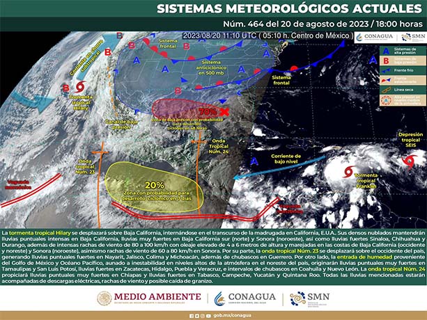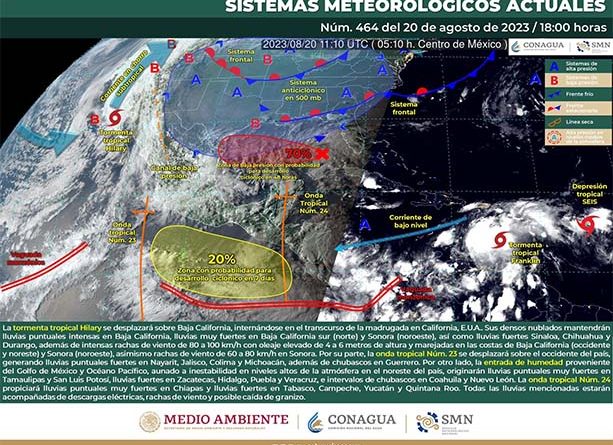 Durante esta noche y madrugada, la onda tropical número 23 se desplazará sobre el occidente del país, generando lluvias puntuales fuertes en regiones de Colima, Nayarit, Jalisco y Michoacán, además de chubascos en Guerrero.
